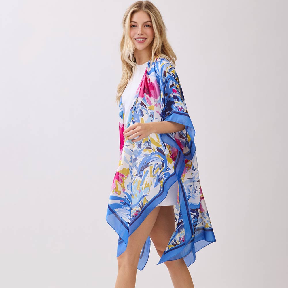 • This open front kimono poncho features an expressive abstract print with a fluid silhouette designed for easy layering. Ideal for boutiques seeking statement layering pieces, it elevates casual outfits, resort wear, and travel styling while offering a lightweight, relaxed fit that transitions effortlessly from day to evening.