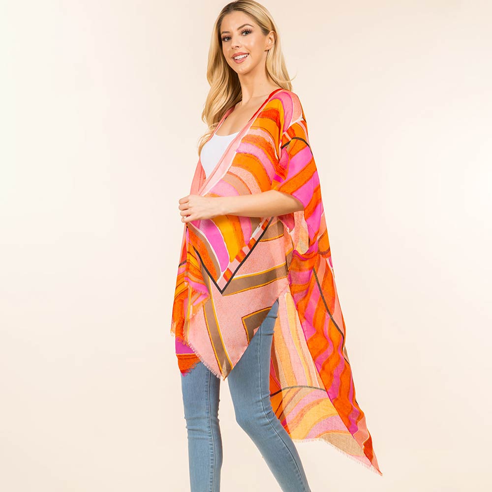 Abstract Geometric Pattern Open Front Long Kimono Poncho
