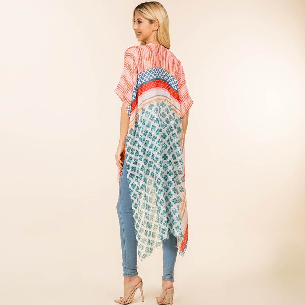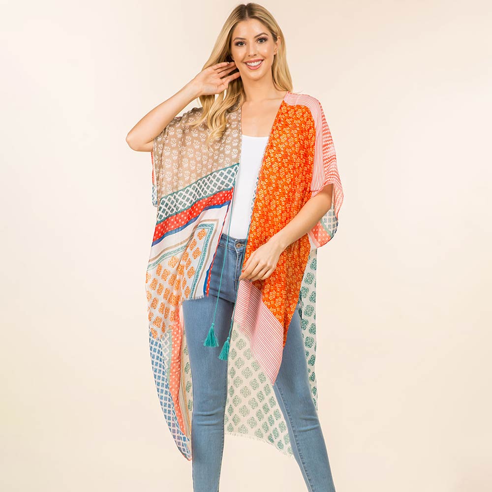 • Effortlessly elevate everyday outfits with this patchwork print open front kimono. Designed for versatile layering, it drapes beautifully over casual or dressy looks. A lightweight statement piece perfect for boutiques, seasonal styling, and trend-focused collections.