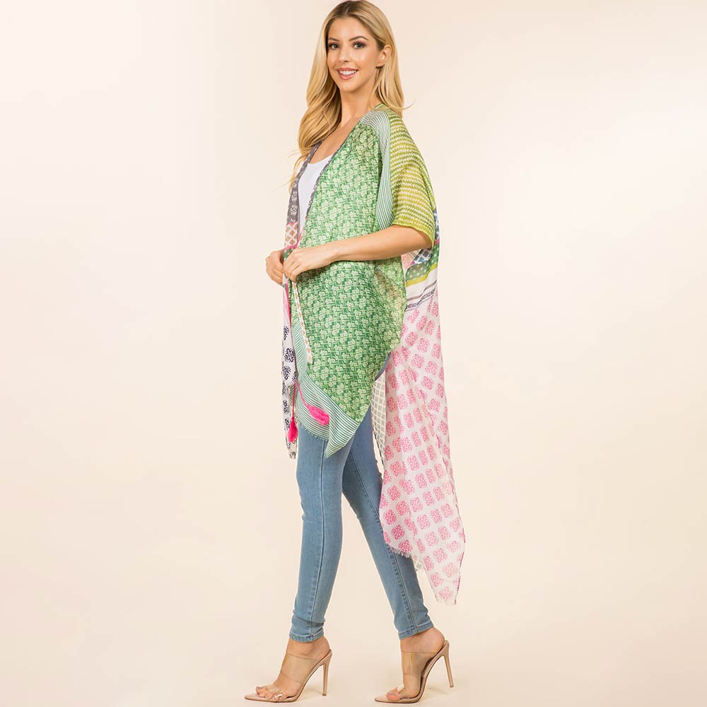 • Effortlessly elevate everyday outfits with this patchwork print open front kimono. Designed for versatile layering, it drapes beautifully over casual or dressy looks. A lightweight statement piece perfect for boutiques, seasonal styling, and trend-focused collections.