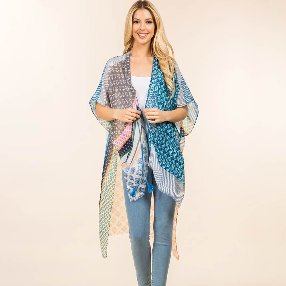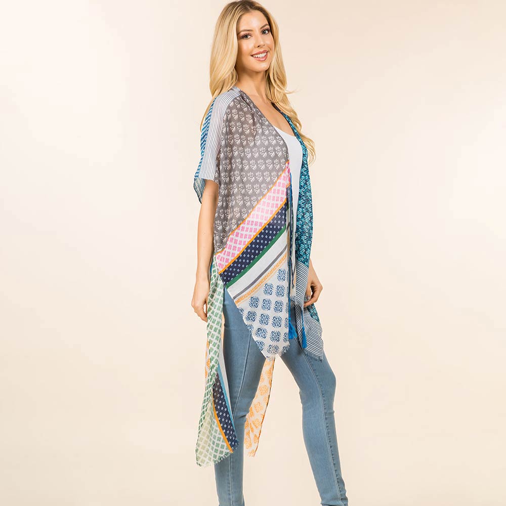 Details • Size : One Size • Material : 100% Polyester • Effortlessly elevate everyday outfits with this patchwork print open front kimono. Designed for versatile layering, it drapes beautifully over casual or dressy looks. A lightweight statement piece perfect for boutiques, seasonal styling, and trend-focused collections.
