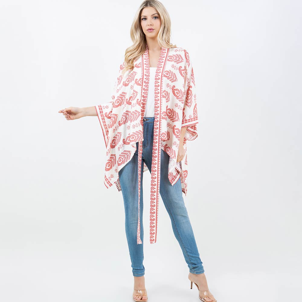 • Flowy kimono-style wrap designed with a bold geometric print and a flattering tie-front detail for versatile styling. Drapes effortlessly over tops and casual outfits for everyday wear or travel looks. A stylish layering piece perfect for gifting and boutique collections seeking relaxed, modern appeal.