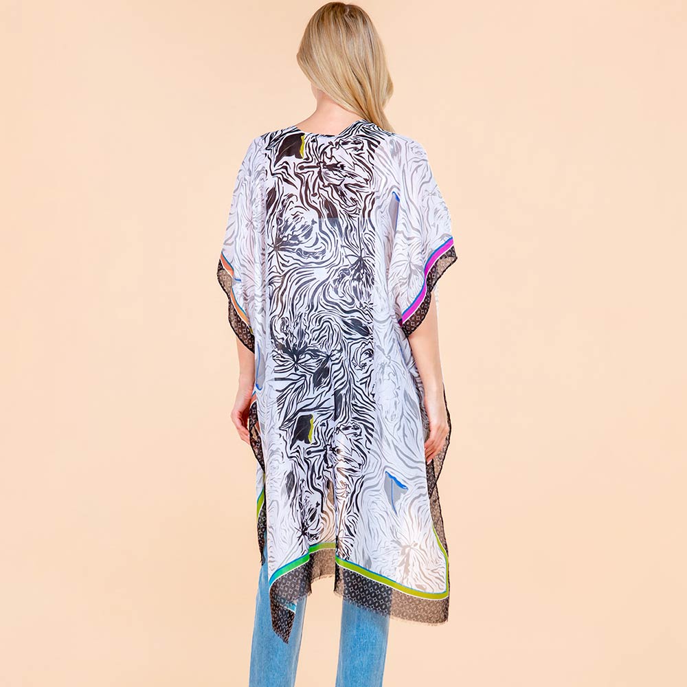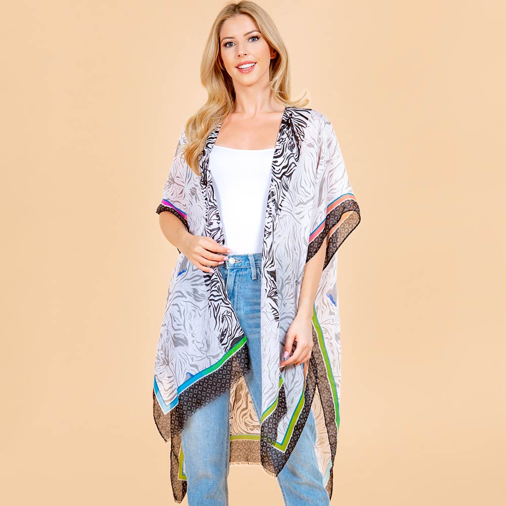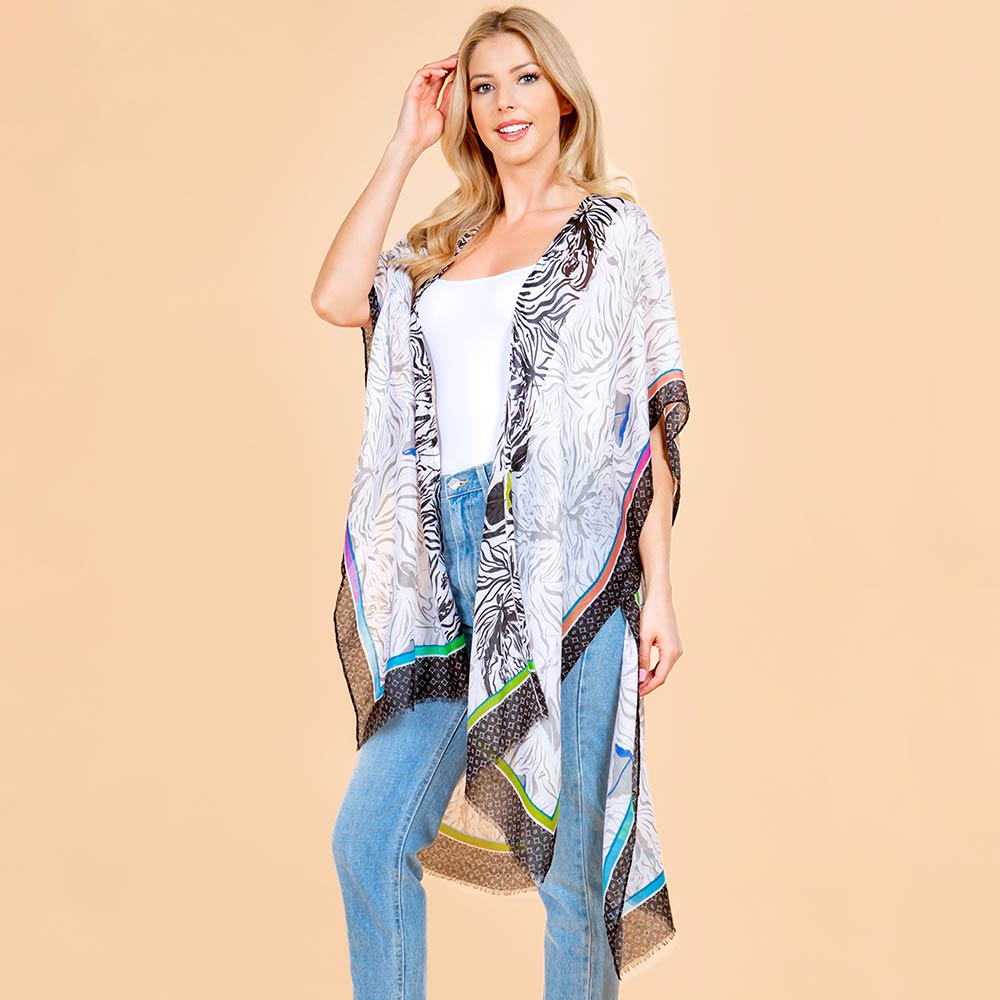 • Flowy open front kimono wrap designed with a relaxed silhouette and detailed printed accents for effortless layering. Easy to style over tops or dresses, it adds light coverage, movement, and a polished finish for everyday wear, travel outfits, or casual occasions.