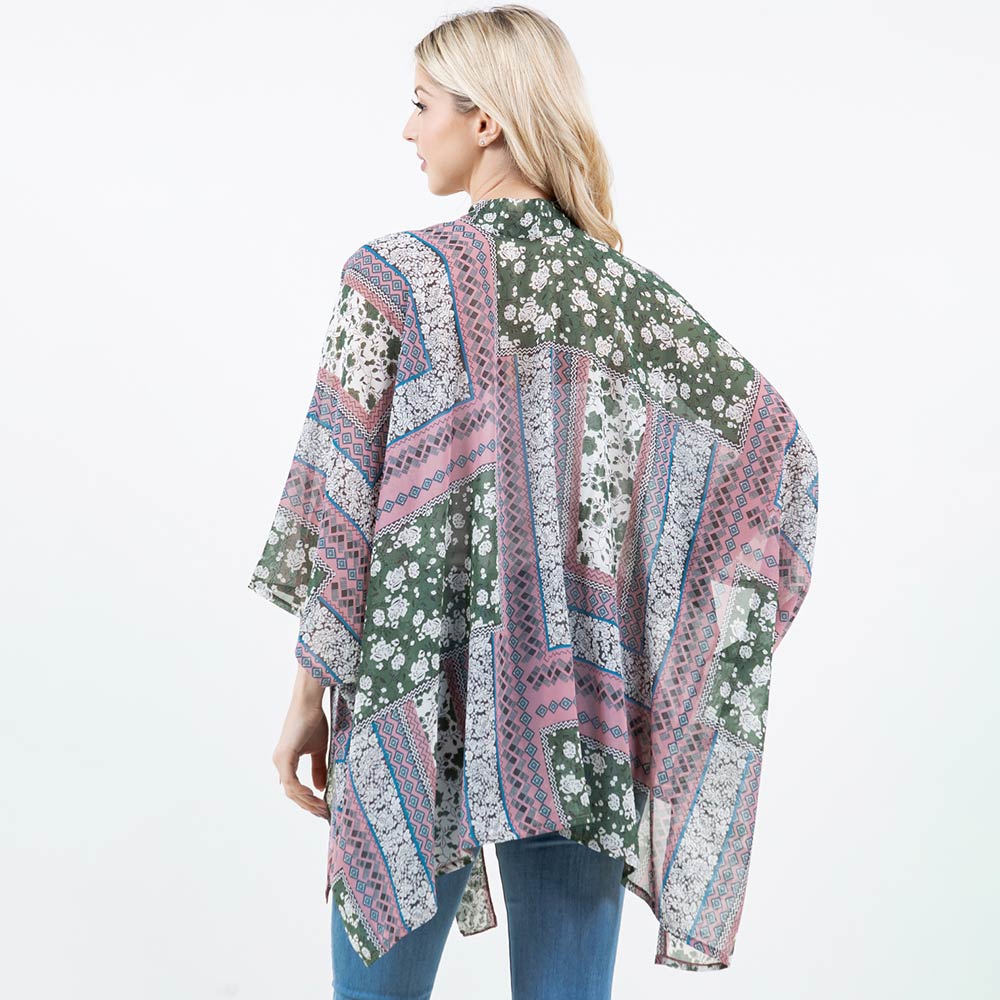 Lightweight Short Sleeves Floral Patchwork Pattern Open Front Kimono Poncho