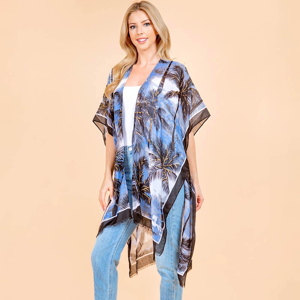 Palm Tree Leaf Pattern Open Front Kimono Poncho Wrap