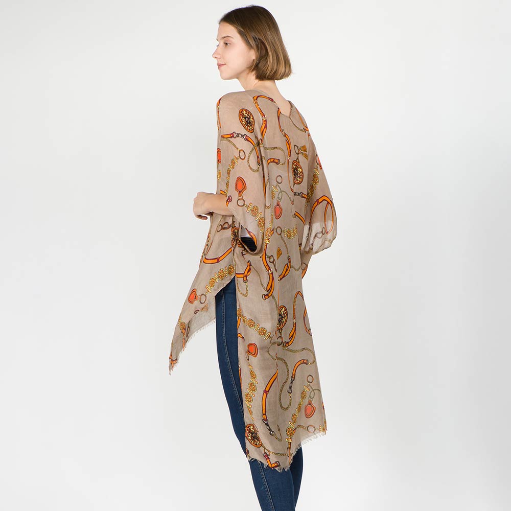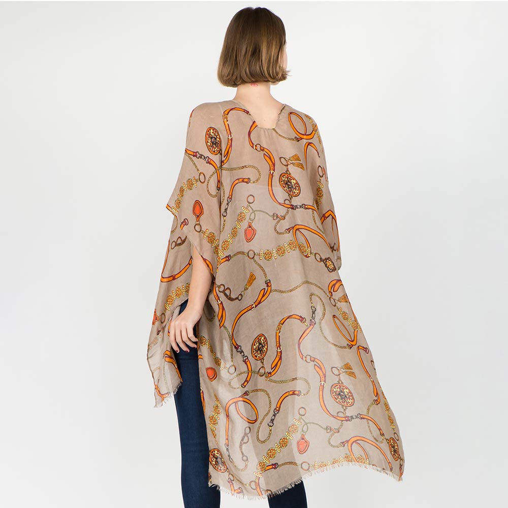 • Elegant open front kimono wrap featuring a bold chain-inspired motif and fluid drape. Designed for easy layering over everyday outfits, this versatile silhouette adds statement style for casual wear, travel looks, boutique collections, and elevated resort-inspired styling. Perfect for year-round accessory merchandising.