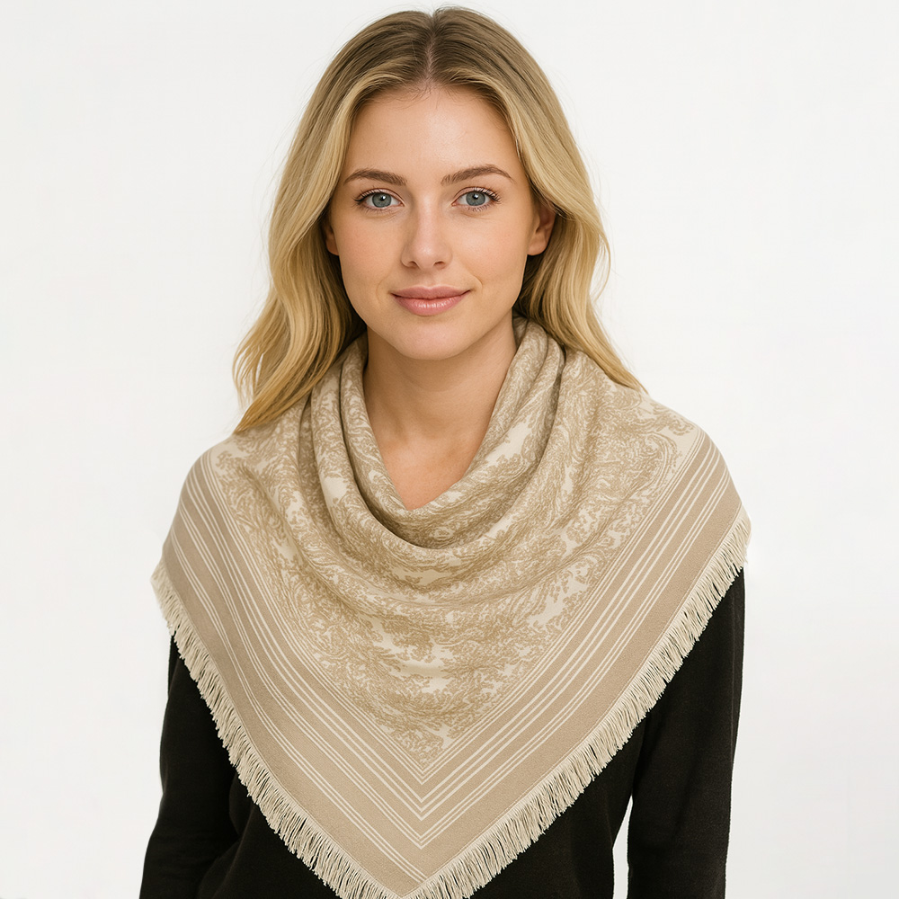 • Elevate your wardrobe with this elegant printed square scarf featuring a mix of floral and stripe patterns with delicate fringe edges. Versatile and timeless, it adds sophistication to any outfit, perfect for layering in all seasons or gifting someone with refined style.