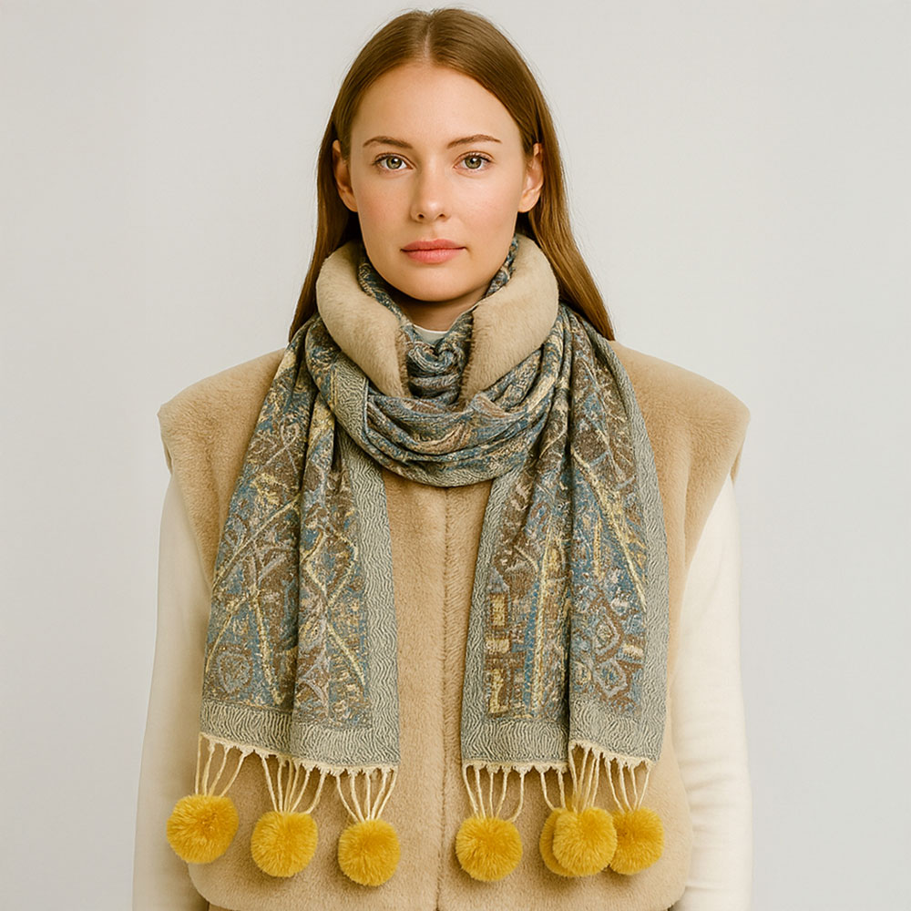 • Add a touch of sophistication to any outfit with this beautifully patterned scarf featuring soft pom tassel accents. Its cozy, lightweight design drapes effortlessly, making it perfect for elevating everyday looks and adding stylish warmth throughout the season.