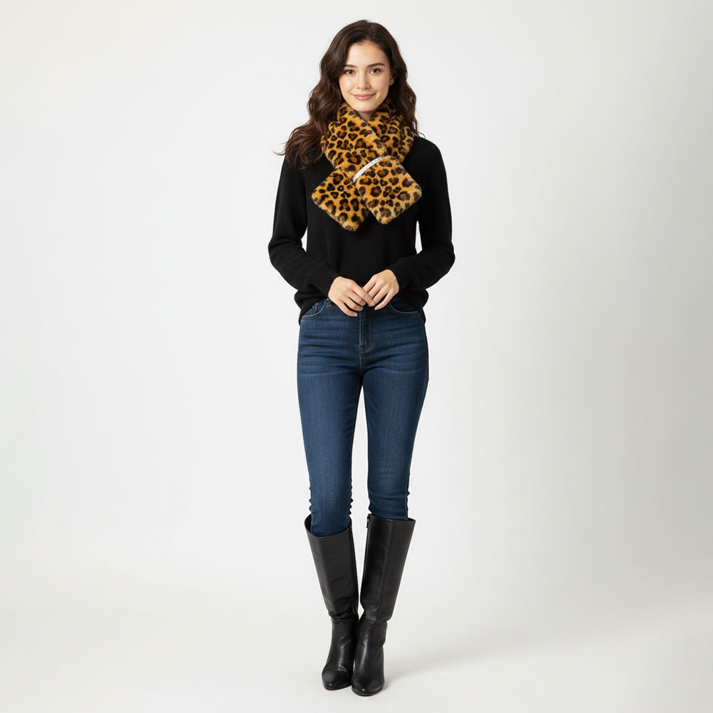 • Luxurious faux fur scarf featuring a bold leopard pattern and slip-through design for easy wear. Soft, warm, and stylish, it adds a statement touch to winter outfits while keeping you cozy in cold weather.