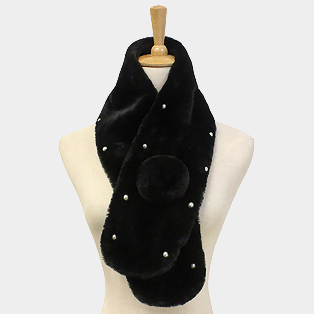 Pearl Embellished Faux Fur Pom Pom Pull Through Scarf