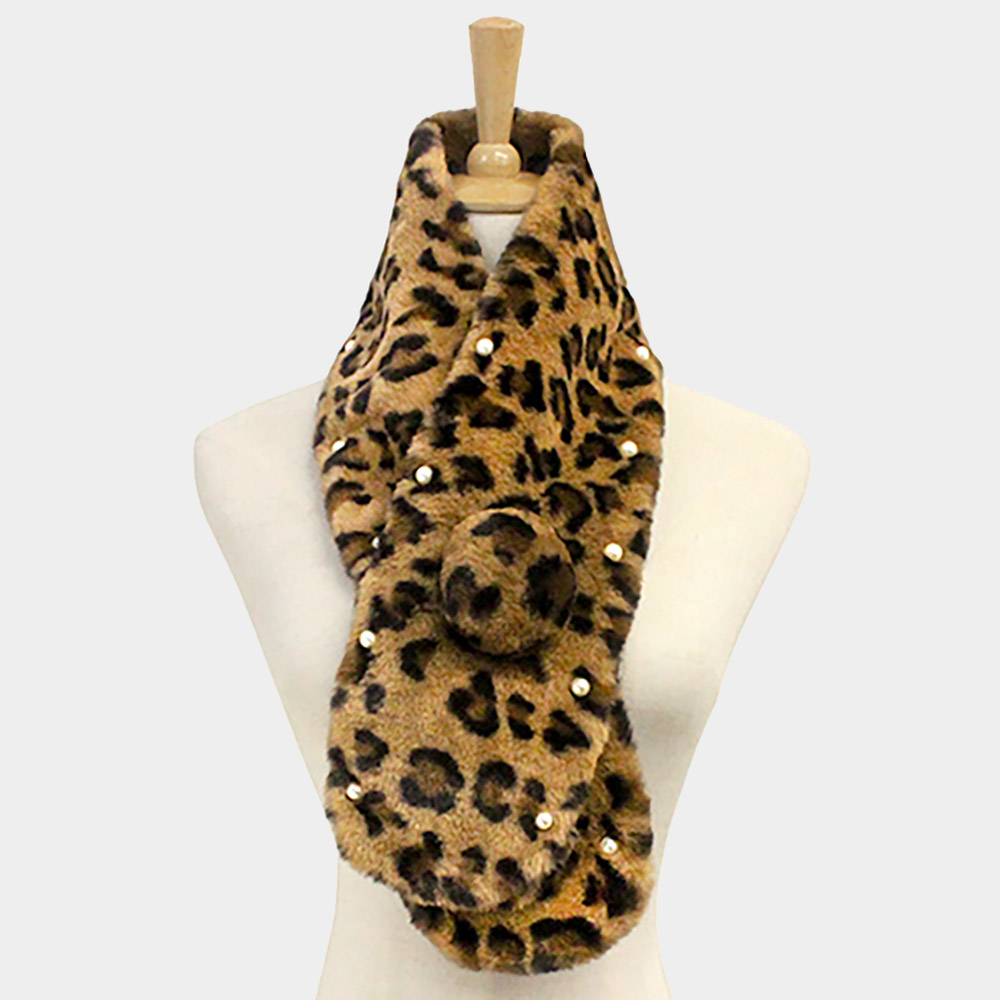 Pearl Embellished Leopard Patterned Faux Fur Pom Pom Pull Through Scarf Pearl Embellished Leopard Patterned Faux Fur Pom Pom Pull Through Scarf