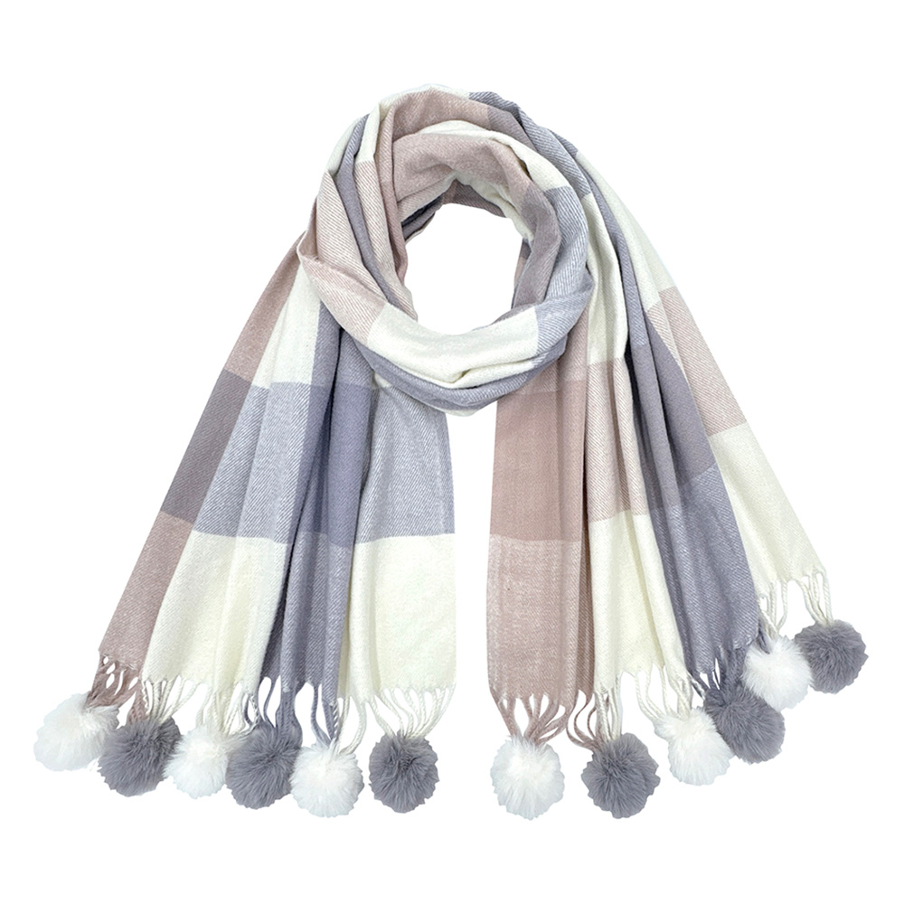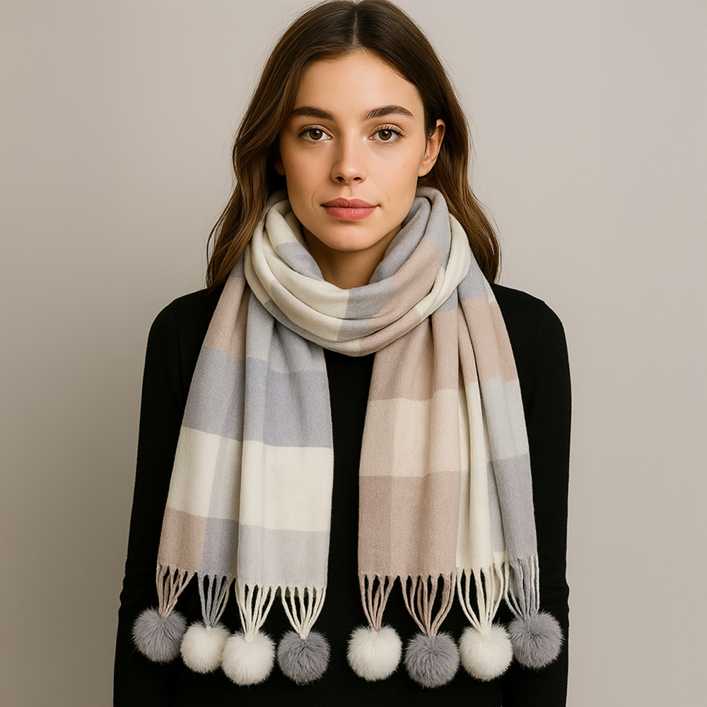 • Elegant checkered scarf with soft texture and playful pom-pom tassels. A versatile wrap that blends warmth and chic style, perfect for layering with casual or dressy looks, making it a must-have accessory for any season.