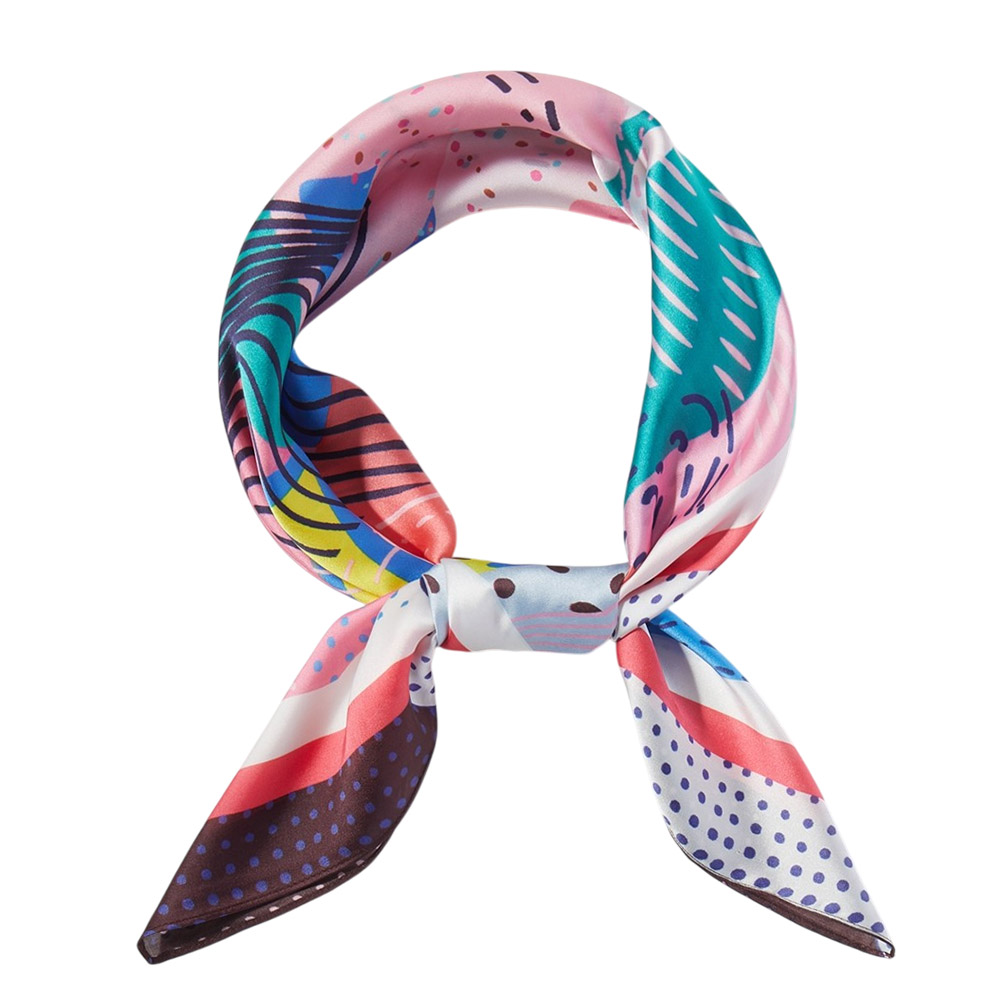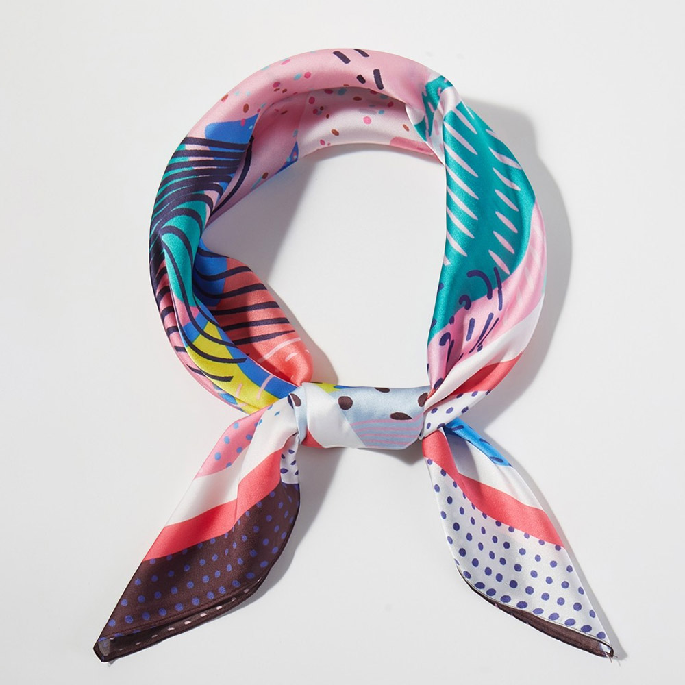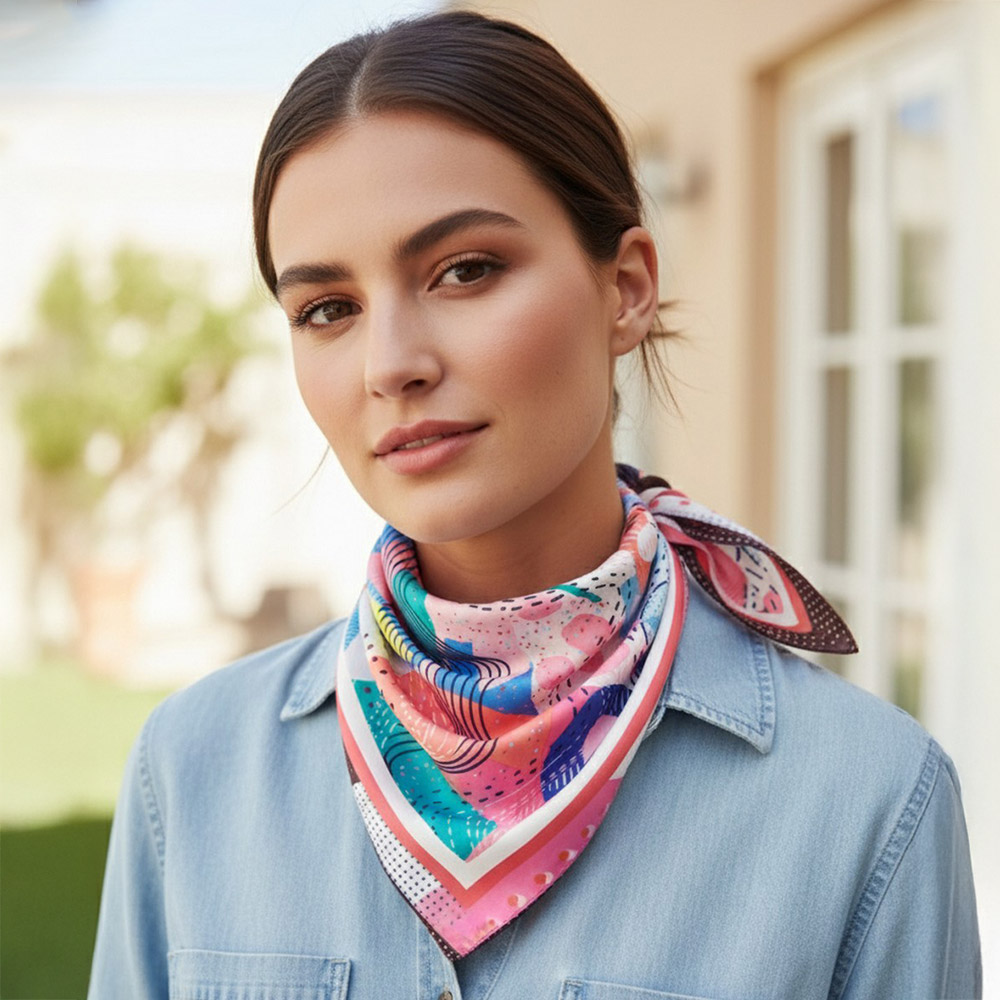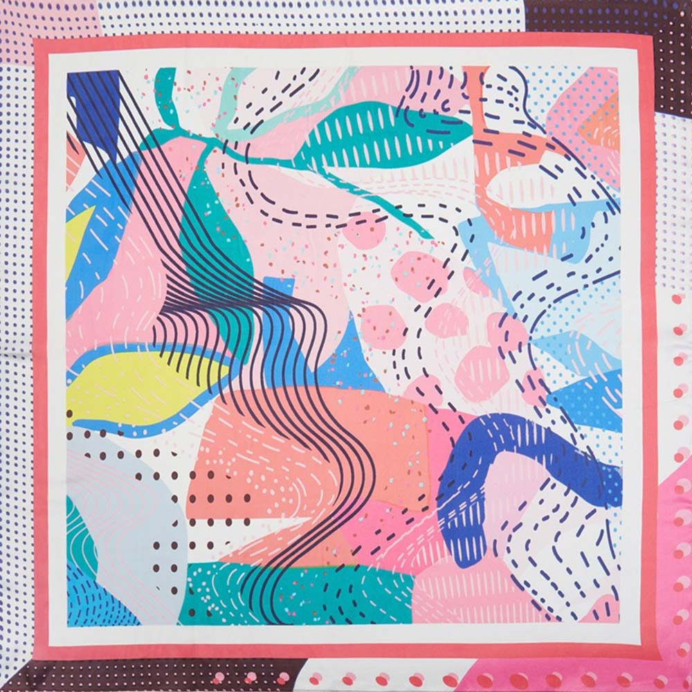 • Square fashion scarf featuring an expressive abstract art design with dynamic shapes and flowing patterns. Designed for versatile styling as a neck scarf, hair accessory, or bag accent, making it ideal for boutiques seeking modern statement accessories with everyday wear appeal and seasonal flexibility.