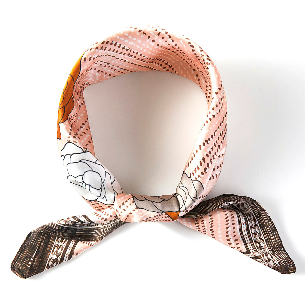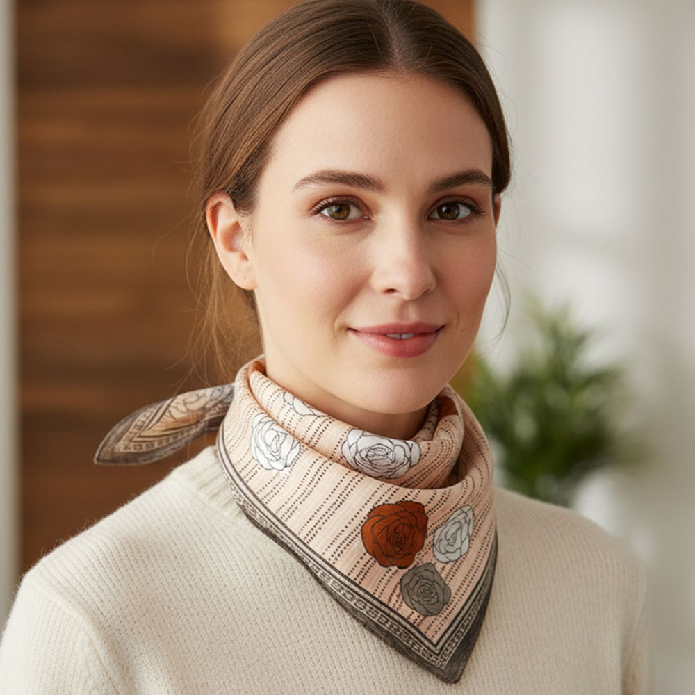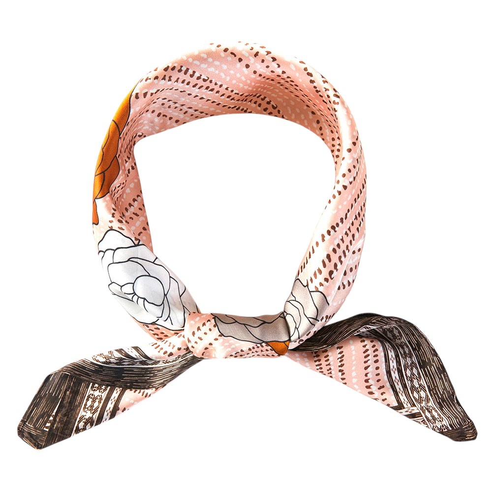 Details • Size : 27.5" X 27.5" • Material : 100% Polyester • Elevate your look with this elegant square scarf featuring a delicate floral pattern arranged across dotted lines and framed by a decorative brown border. Perfectly sized for versatile styling around the neck, hair, or handbag, this lightweight accessory adds a refined touch to casual or dressy outfits. A stylish everyday essential for gifting or personal wear.