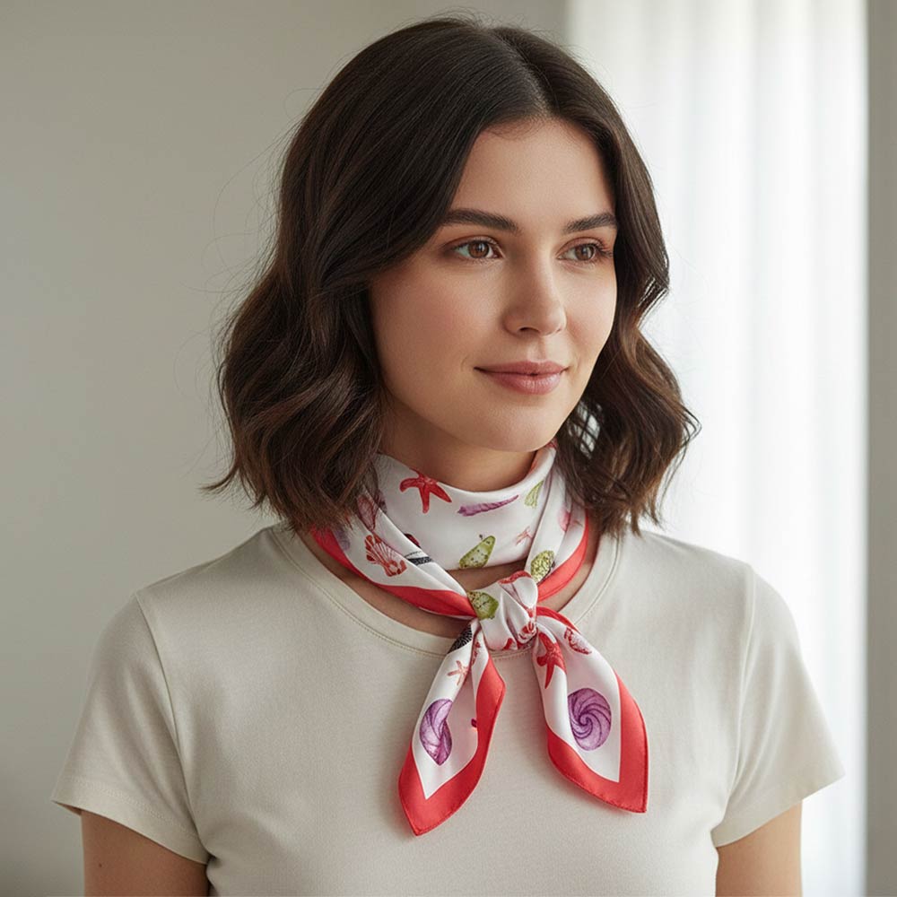 • This square fashion scarf features a playful sea life pattern with starfish, shells, and ocean-inspired motifs for a fresh, coastal feel. Designed for versatile styling around the neck, hair, or handbag, it adds personality to casual and resort looks. Ideal for seasonal collections, beach boutiques, gifts, and everyday accessorizing with a fun, nature-inspired touch.