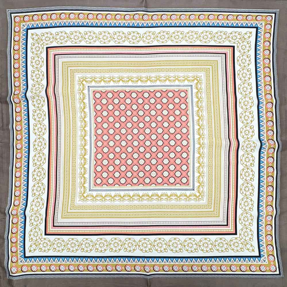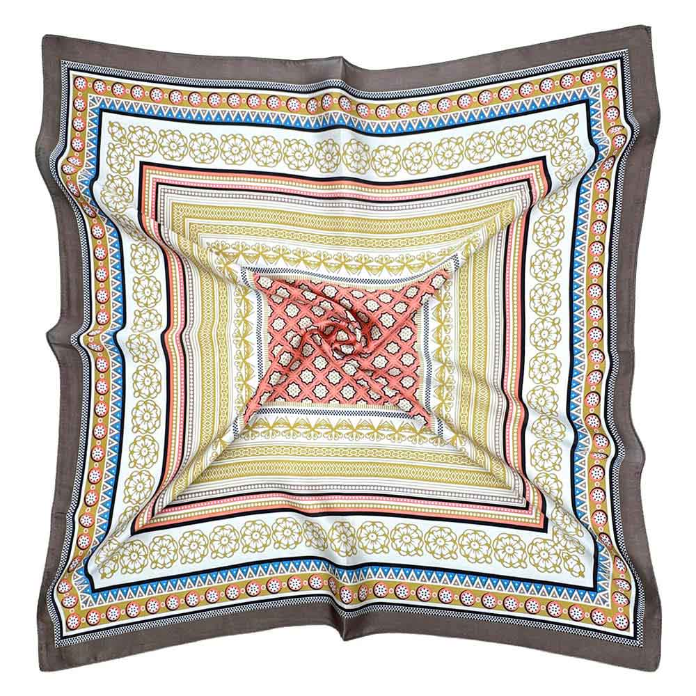 • This square fashion scarf features an intricate geometric center framed by layered floral and ornamental borders, creating a balanced and eye-catching design. Easy to style around the neck, as a hair accessory, or tied to a handbag, it adds a refined accent to casual and dressy looks. A versatile, pattern-driven accessory ideal for boutique collections seeking statement scarves with timeless appeal and multiple styling options.