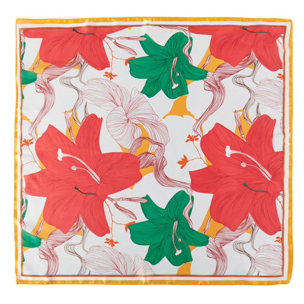 Details • Size : 27.5" X 27.5" • Material : 100% Polyester • Modern square fashion scarf featuring a bold lily floral print with a smooth, lightweight drape for versatile styling. Perfect as a neck scarf, hair tie, or handbag accessory, adding a chic and artistic touch to everyday outfits, travel looks, and office wear. A stylish gift for anyone who loves standout florals.
