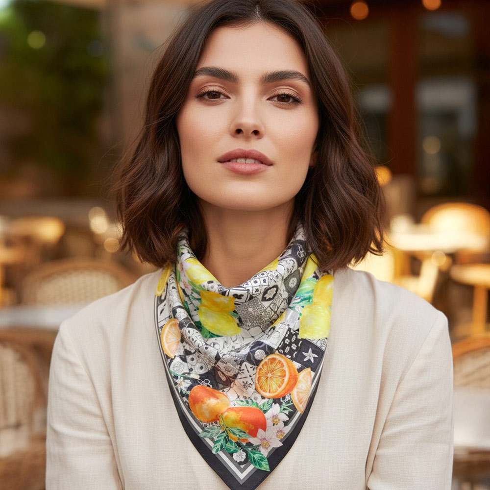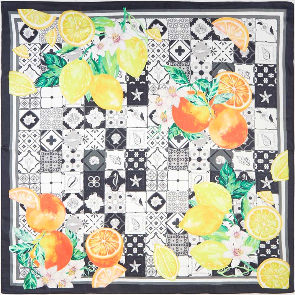 • Eye-catching square fashion scarf featuring a lively citrus fruit and botanical motif with decorative tile-inspired detailing. Designed for versatile styling on the neck, hair, wrist, or handbag. A statement accessory perfect for boutique collections, resort themes, and everyday outfit layering.