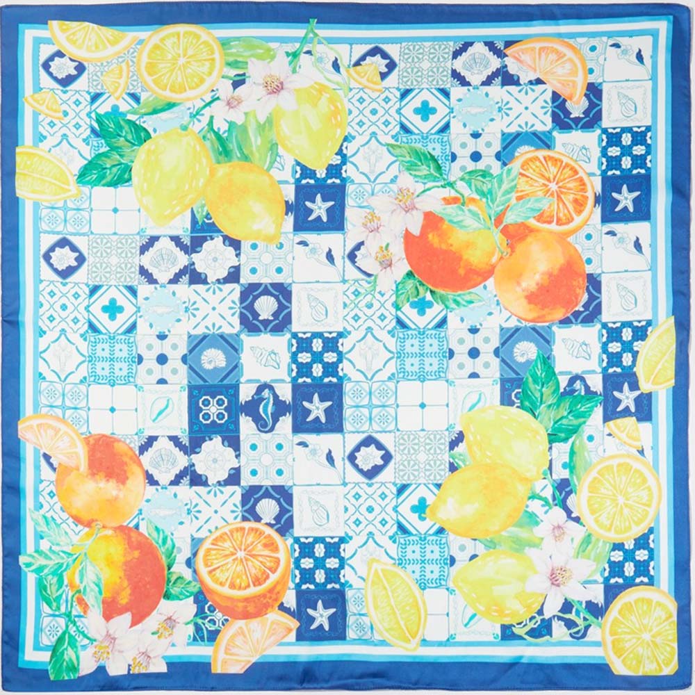 Details • Size : 27.5" X 27.5" • Material : 100% Polyester • Eye-catching square fashion scarf featuring a lively citrus fruit and botanical motif with decorative tile-inspired detailing. Designed for versatile styling on the neck, hair, wrist, or handbag. A statement accessory perfect for boutique collections, resort themes, and everyday outfit layering.
