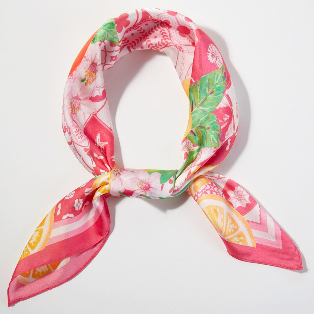 • Eye-catching square fashion scarf featuring a lively citrus fruit and botanical motif with decorative tile-inspired detailing. Designed for versatile styling on the neck, hair, wrist, or handbag. A statement accessory perfect for boutique collections, resort themes, and everyday outfit layering.