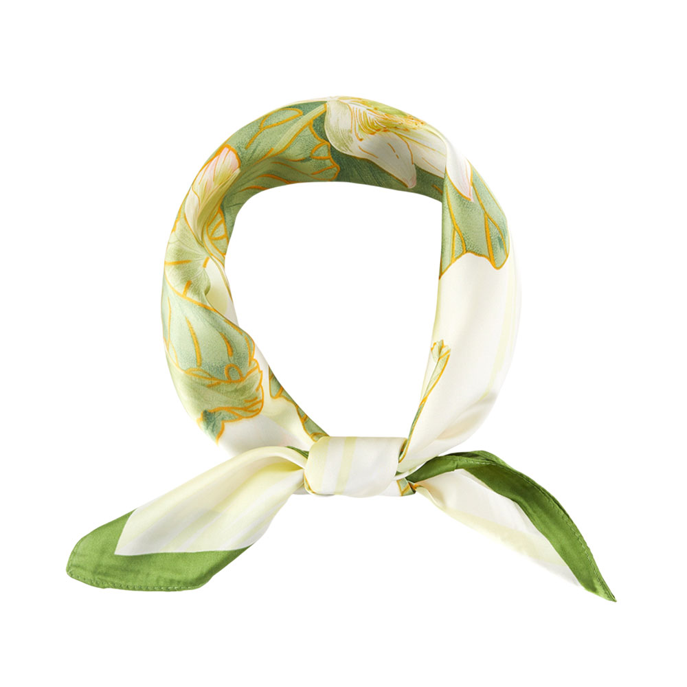 • Bring tranquil elegance to your wardrobe with this exquisite square scarf. It features a stunning, detailed illustration of water lilies (lotus flowers) and large, gracefully drawn leaves against a light, painterly background. Crafted from a smooth, luxurious satin-feel fabric, this scarf is the perfect serene accessory to elevate any outfit with its sophisticated and artistic floral design.