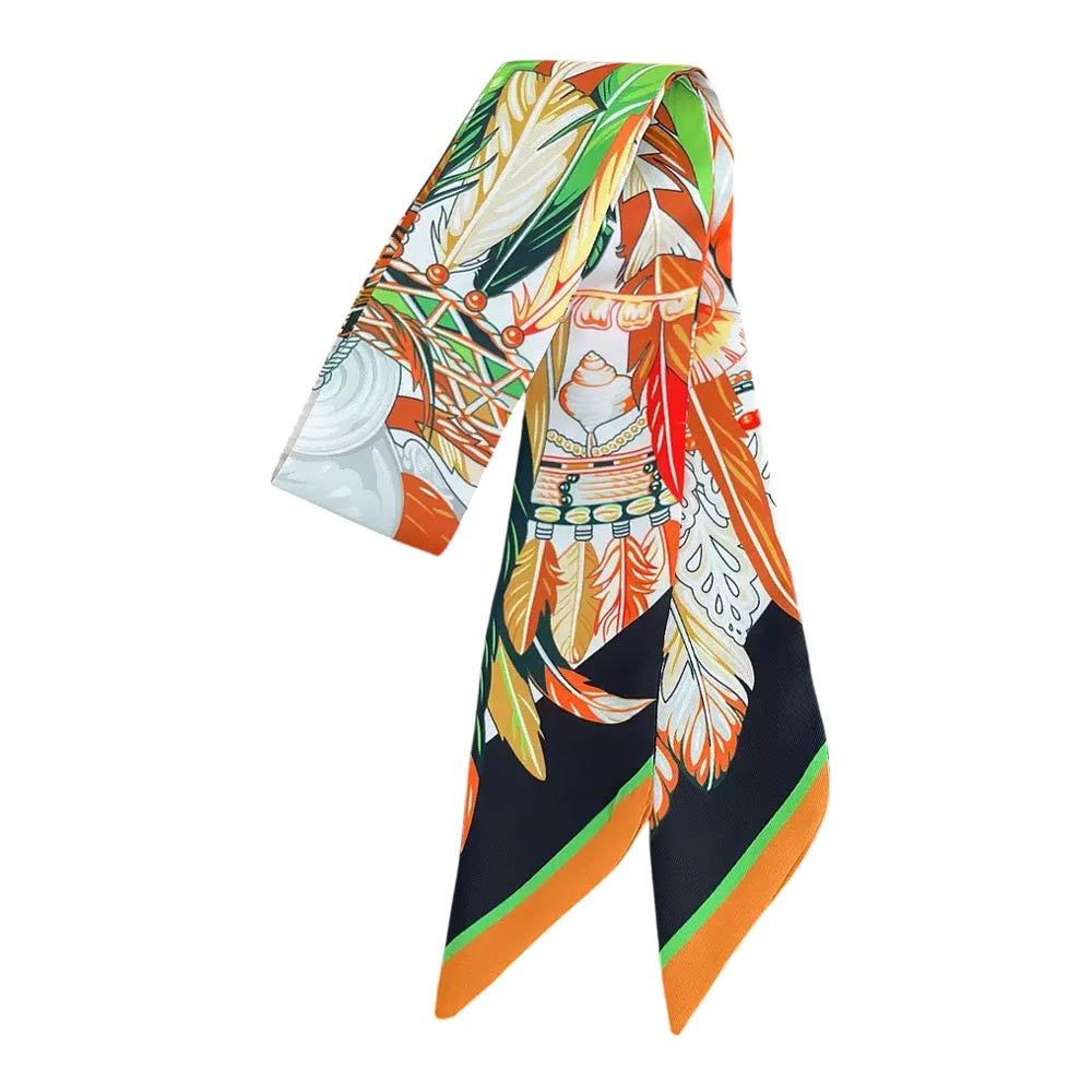 Details • Size : 2" X 35.4" • Material : 100% Polyester • Feather print skinny scarf designed for versatile styling on hair, handbags, wrists, or necks. The elongated silhouette adds a bold, artistic accent to everyday outfits, boutique displays, and giftable collections, offering an easy way to elevate casual or dressy looks.