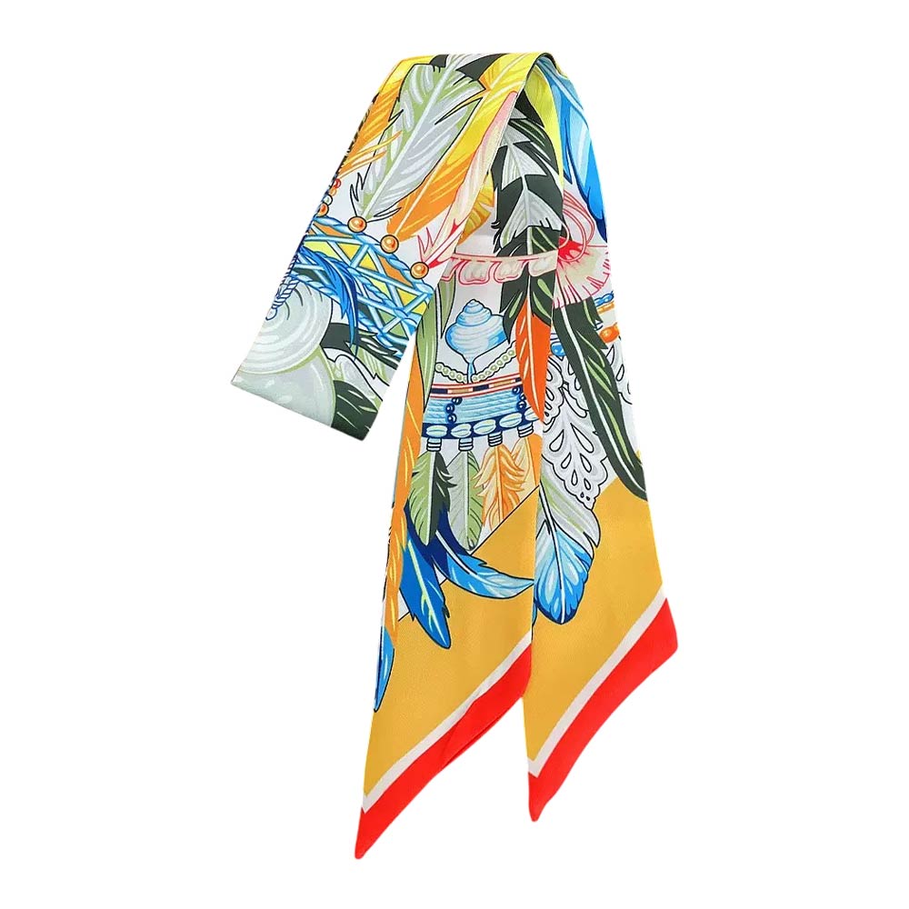 Details • Size : 2" X 35.4" • Material : 100% Polyester • Feather print skinny scarf designed for versatile styling on hair, handbags, wrists, or necks. The elongated silhouette adds a bold, artistic accent to everyday outfits, boutique displays, and giftable collections, offering an easy way to elevate casual or dressy looks.