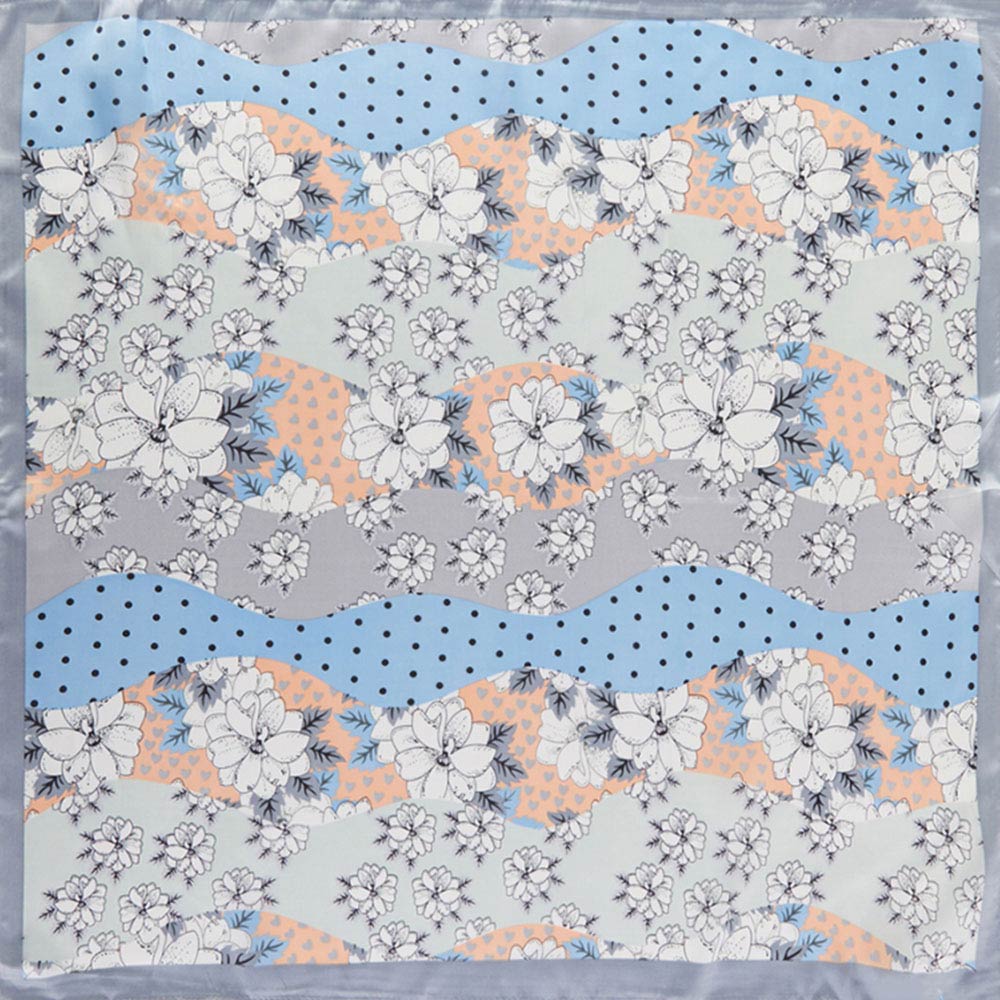 Details • Size : 27.5" X 27.5" • Material : 100% Polyester • This square scarf showcases a charming patchwork of floral motifs and playful dotted accents, offering a soft, artistic look. Lightweight and versatile, it adds a refined touch to everyday outfits, perfect for styling around the neck, hair, or as an accessory on bags.