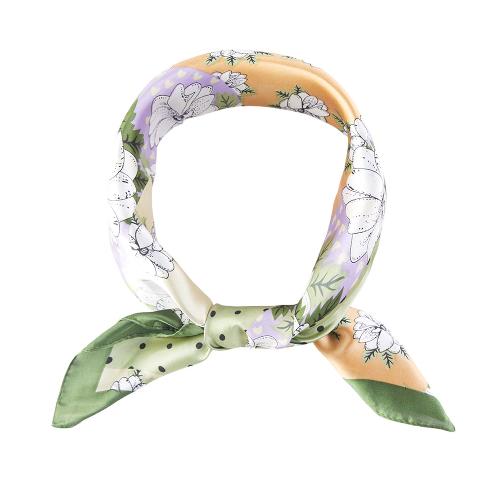 • This square scarf showcases a charming patchwork of floral motifs and playful dotted accents, offering a soft, artistic look. Lightweight and versatile, it adds a refined touch to everyday outfits, perfect for styling around the neck, hair, or as an accessory on bags.