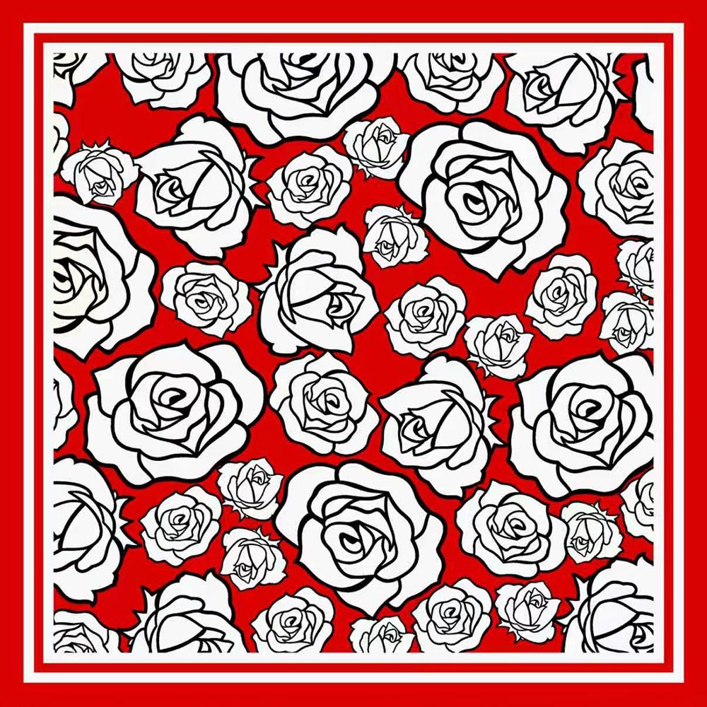 Details • Size : 23.45" X 23.45" • Material : 100% Polyester • Elegant square scarf featuring an allover rose-inspired print framed by a clean border design. Lightweight and versatile for styling around the neck, hair, bag, or wrist. Perfect for everyday wear, travel, gifting, and adding a bold yet timeless floral statement to any outfit.