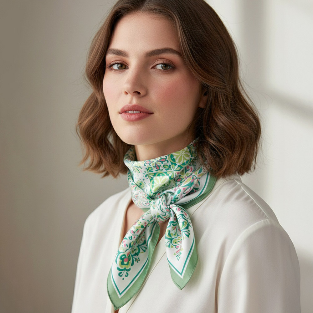 • Eye-catching square fashion scarf featuring an intricate Mediterranean tile-inspired pattern. Designed for versatile styling on the neck, hair, wrist, or handbag, this statement accessory adds artistic flair and boutique appeal to everyday outfits, resort looks, and curated fashion collections.