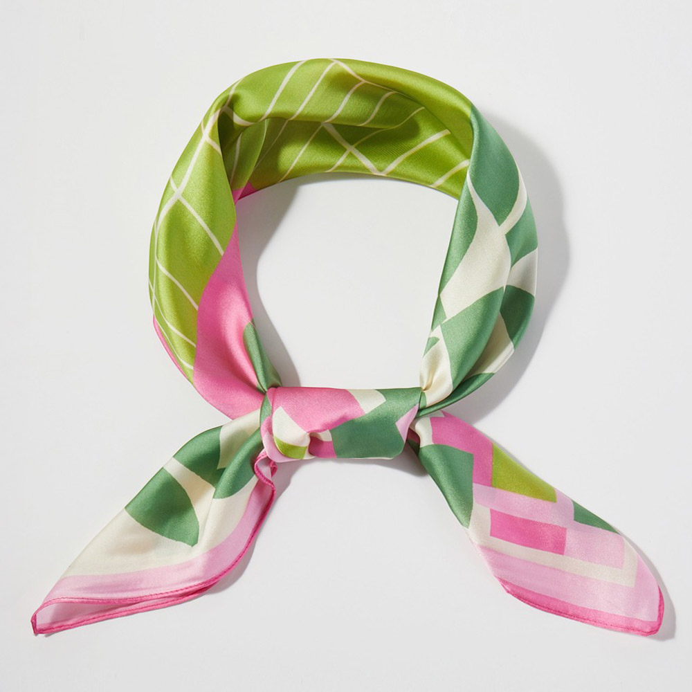 Details • Size : 27.5" X 27.5" • Material : 100% Polyester • Square fashion scarf designed with a bold abstract geometric pattern that blends modern structure and artistic flow. A versatile accessory for neck styling, hair wraps, handbag accents, or boutique displays, offering a statement look suited for everyday wear, seasonal styling, and trend-forward collections.