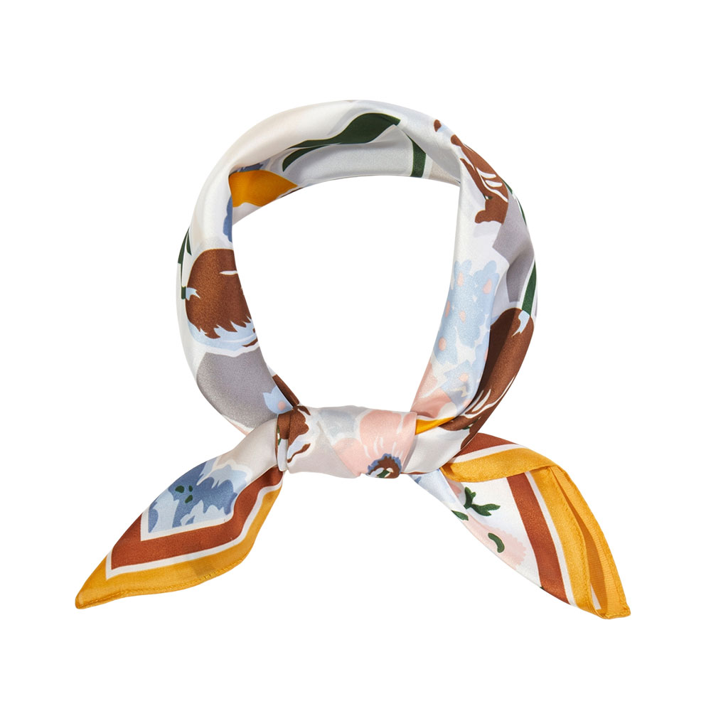 • Add a chic statement to your wardrobe with this square scarf featuring a bold mix of floral and geometric motifs. Its versatile design complements both casual and polished looks, making it ideal for wearing around the neck, in the hair, or as a stylish accessory on bags.
