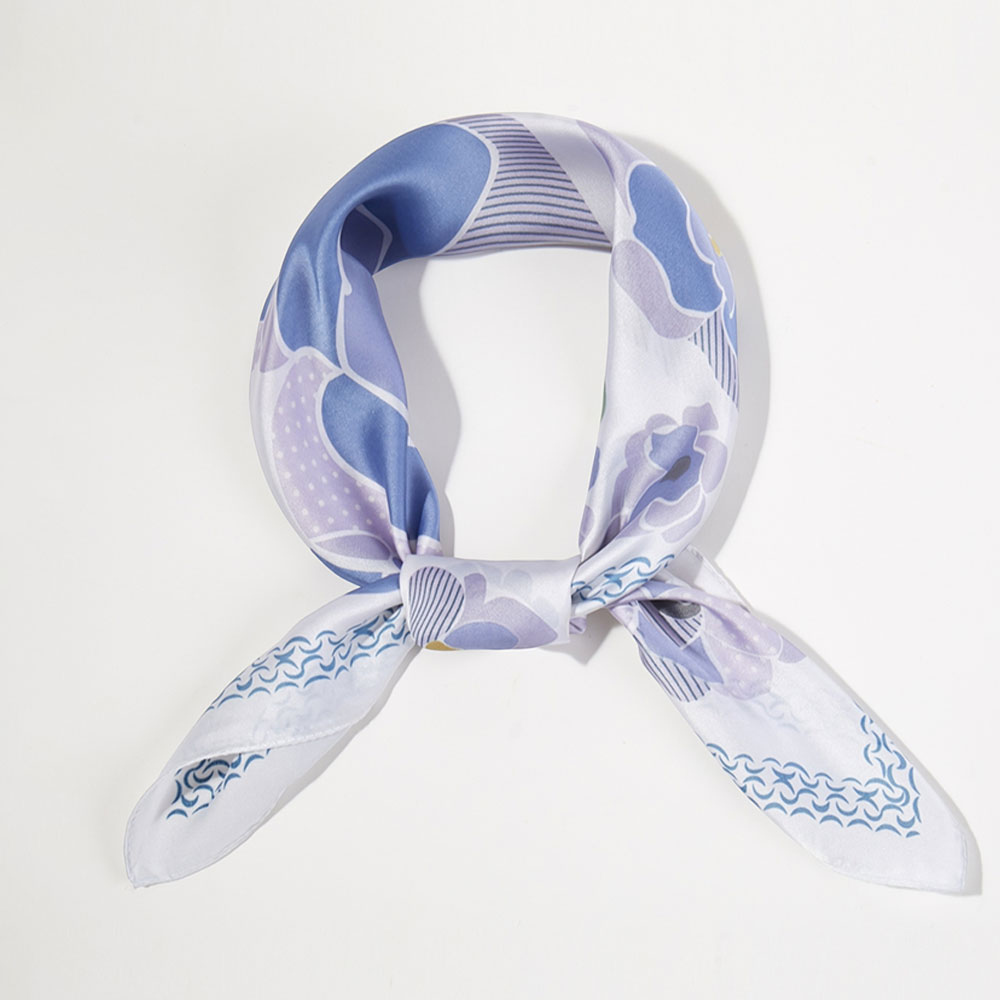 Illustrated Flower Pattern Printed Square Silky Satin Bandana Scarf