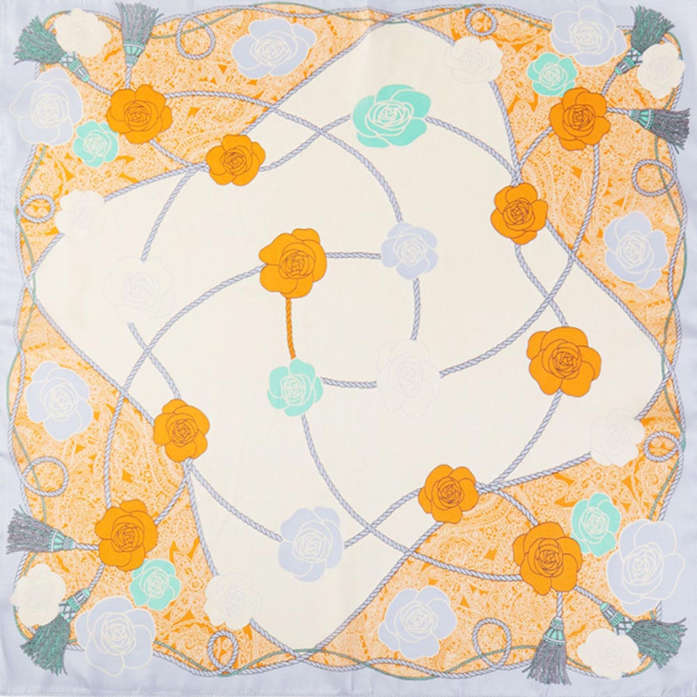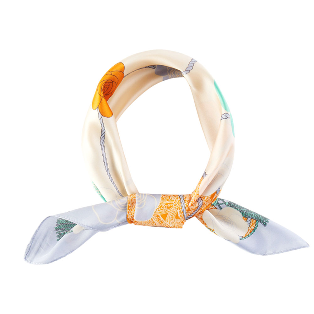 Details • Size : 27.5" X 27.5" • Material : 100% Polyester • Capture a chic, preppy look with this charming square satin-feel scarf. The unique design features stylized roses connected by an intertwined rope pattern, framed by a decorative tassel border and subtle paisley elements. The smooth, luxurious fabric and vibrant, balanced colors make this accessory a delightful statement piece for a classic, sophisticated style. Perfect as a neckerchief or tied to a handbag.