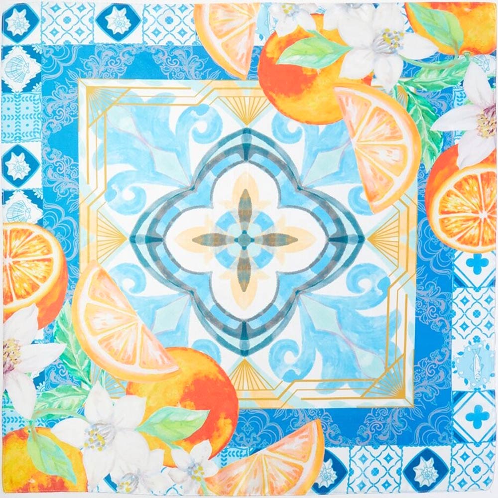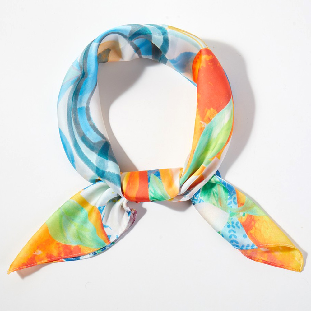 • Statement square scarf featuring an artistic citrus fruit and floral motif with an ornate medallion center and decorative border. Designed for versatile styling on the neck, hair, handbag, or wrist. Ideal for boutique assortments, seasonal displays, and everyday fashion-forward accessorizing.
