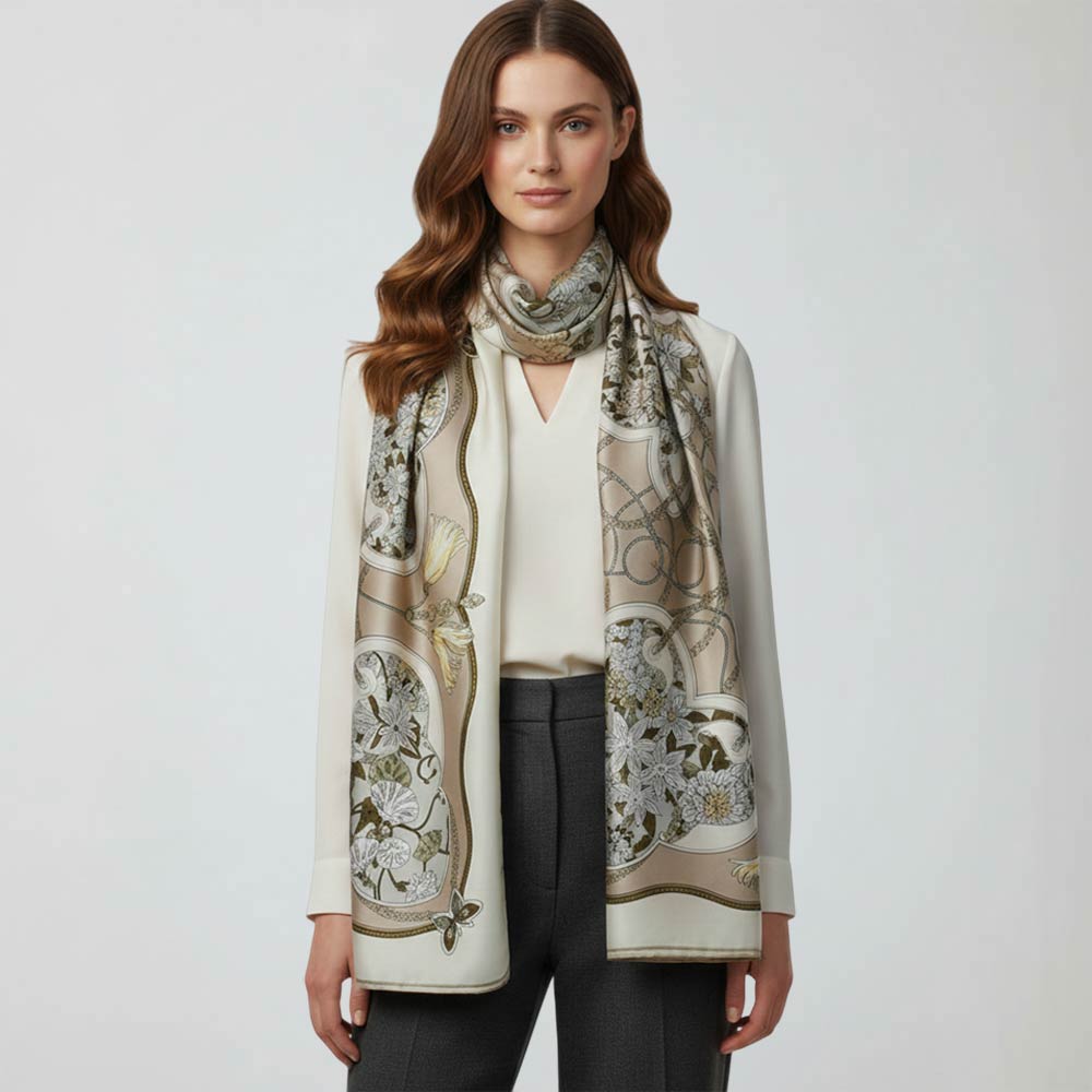 Details • Size : 35" X 78" • Material : 100% Viscose • Breathable, Lightweight, Skin-friendly and Soft • This ornate square scarf showcases a classic symmetrical motif with floral medallions and elegant chain-inspired detailing for a refined, timeless look. Ideal for neck styling, hair accents, handbag wraps, or display, it’s a versatile accessory for boutiques, gifting, and elevated everyday outfits.