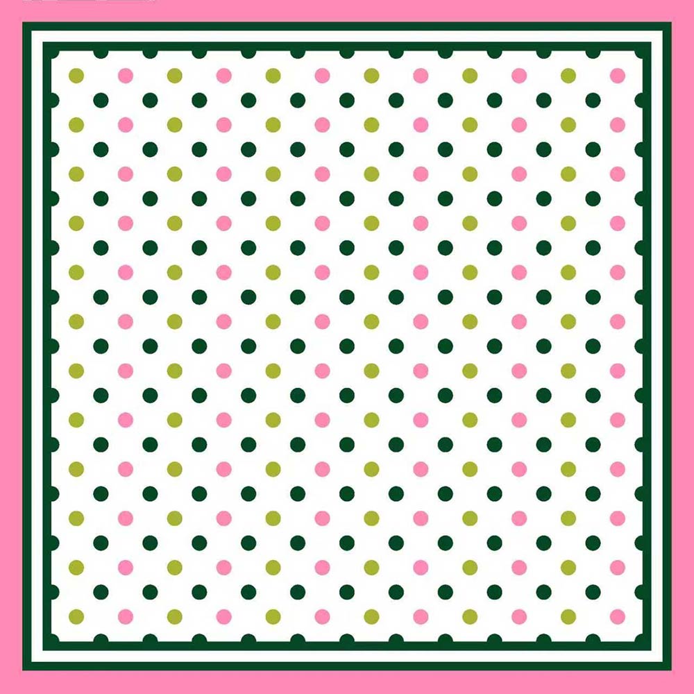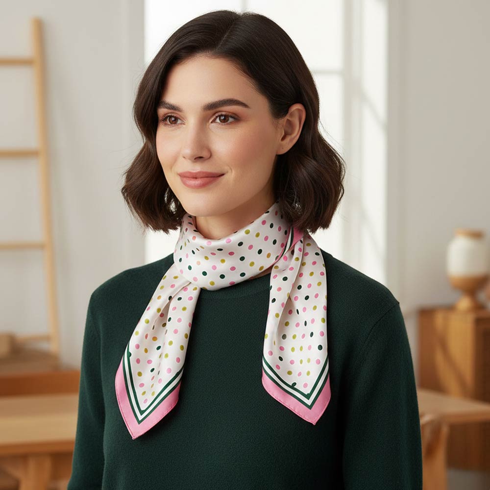 • Chic square scarf featuring a playful polka dot pattern framed by a decorative border for a clean, modern look. Lightweight and versatile for styling around the neck, hair, bag, or wrist. Ideal for everyday wear, travel, gifting, and adding a fun yet polished accent to any outfit.