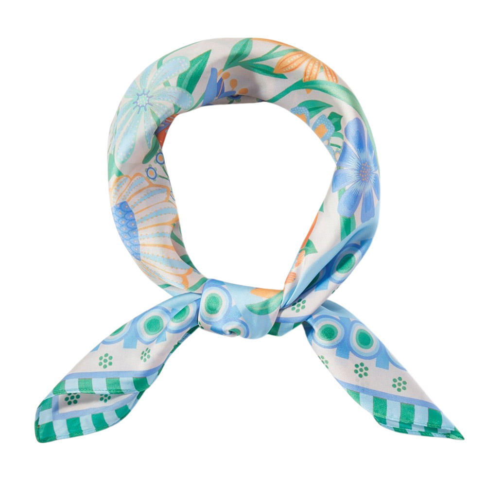 • Square fashion scarf featuring a detailed botanical meadow design with layered floral illustrations and decorative borders. Ideal for styling on the neck, hair, wrist, or handbag, this versatile accessory brings a fresh, artistic accent to everyday looks, seasonal outfits, and curated boutique collections.