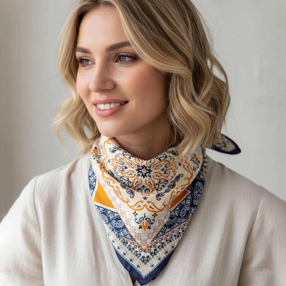 • Vintage-inspired square fashion scarf featuring an elegant baroque print with a smooth, lightweight drape for versatile styling. Wear it as a neck scarf, hair accessory, or handbag accent to elevate everyday outfits, office attire, and travel looks. A classic gift choice for anyone who loves timeless patterns.