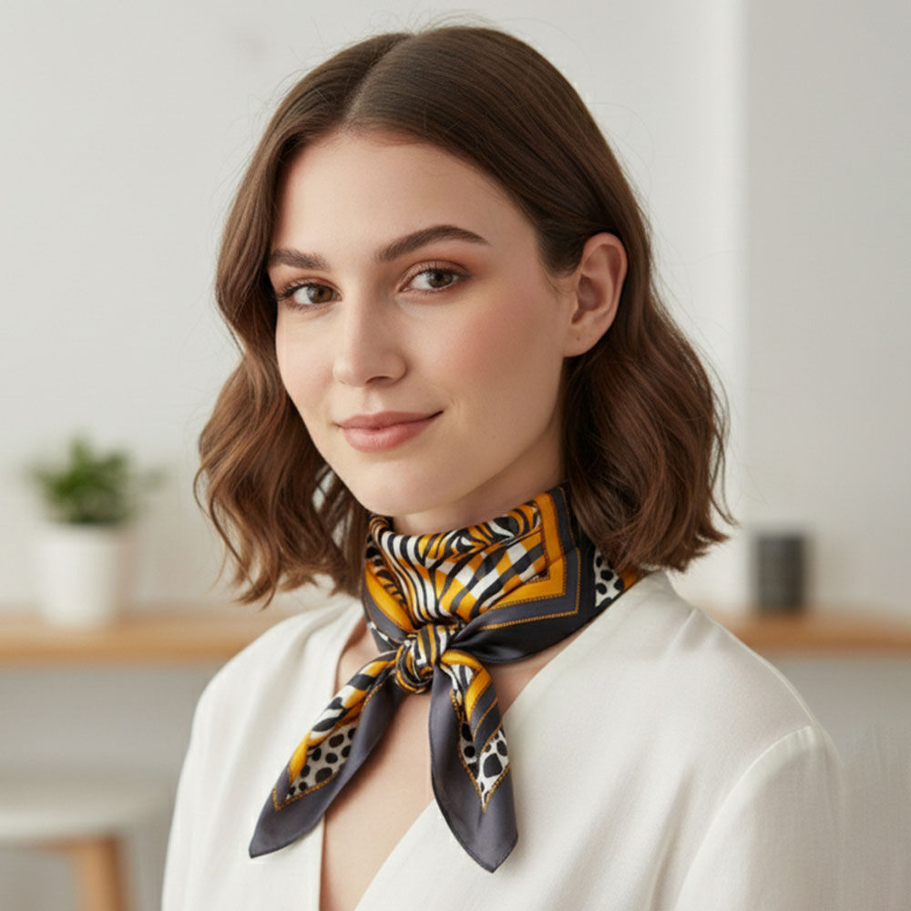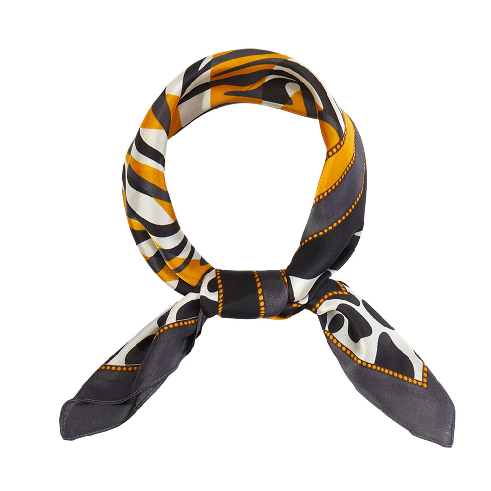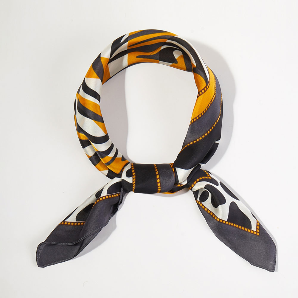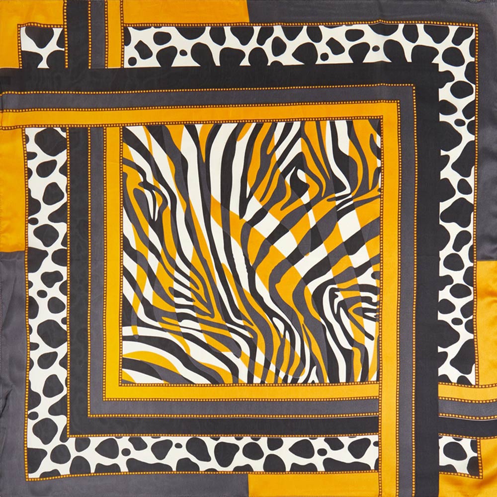 Details • Size : 27.5" X 27.5" • Material : 100% Polyester • Elevate your outfit with this striking zebra and leopard print square scarf featuring bold black, white, and gold patterns with sleek geometric accents. A statement accessory perfect for styling as a neck scarf, hair wrap, headband, or bag tie. Adds a chic, wild touch to casual looks, work outfits, and travel wardrobes while offering lightweight comfort and versatile wear.