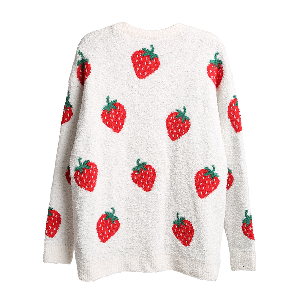 Details • Size : One Size • Material : 100% Poly.Microfiber • Bring sweetness to your wardrobe with this strawberry pattern knit pullover. Featuring a relaxed silhouette, soft textured knit, and playful allover fruit design, it blends comfort with charm—ideal for lounging, layering, or adding a fun touch to casual everyday looks.