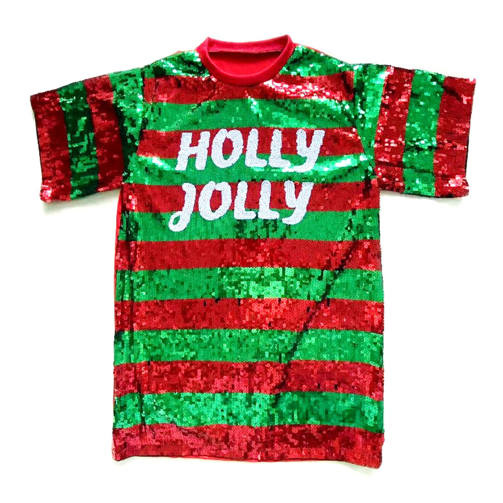 Details • Size : One Size • Bust Size : 42" - 45" L, Length : 30" L • Material : 100% Polyester • Celebrate the season in style with this plus size “Holly Jolly” sequin dress, designed for comfort and sparkle. Featuring a festive striped pattern and playful holiday lettering, it’s the perfect choice for Christmas parties, gatherings, and joyful holiday photo moments.