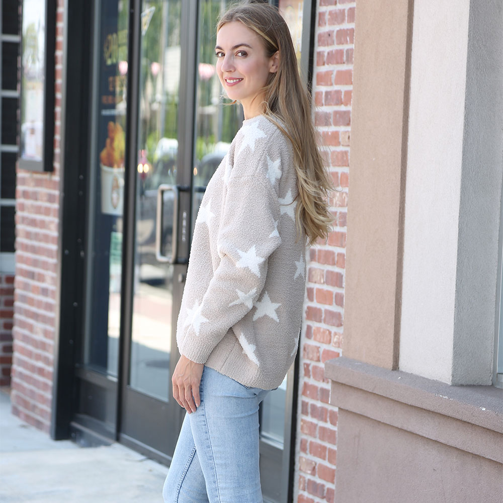 Details • Size : One Size • Material : 100% Poly.Microfiber • Stay cozy and stylish in this soft fuzzy pullover featuring an allover star print. Designed with a relaxed fit and playful charm, it's perfect for lounging or adding fun flair to everyday looks.