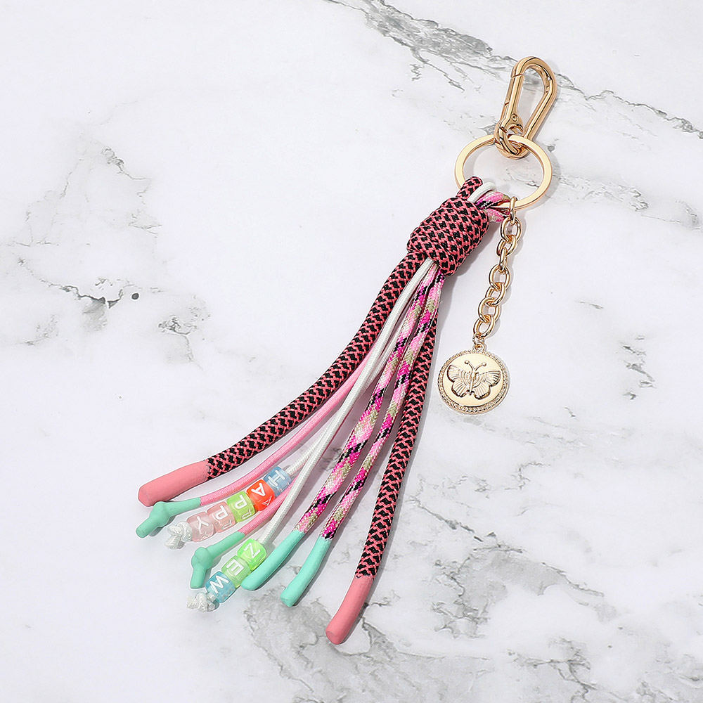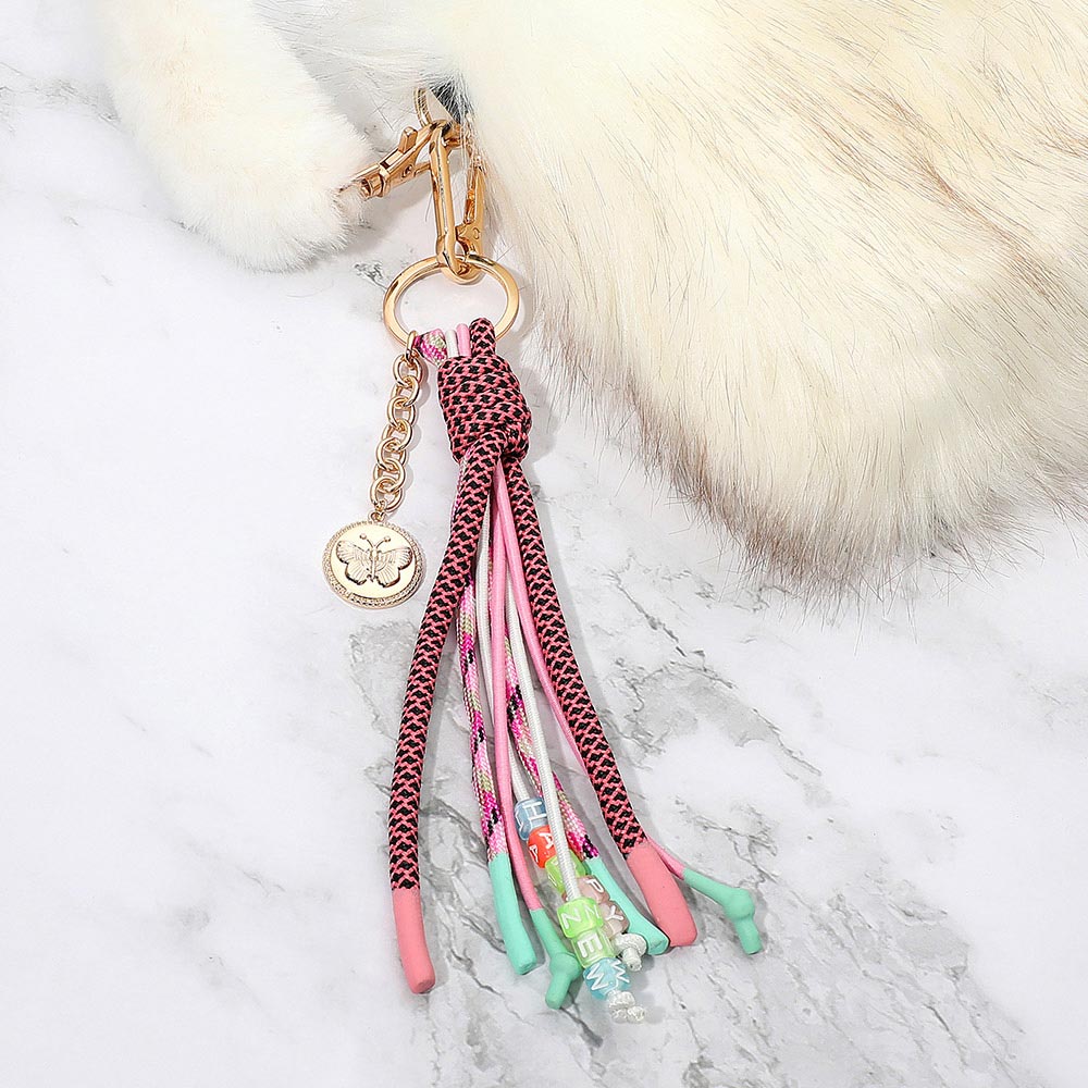 Details • Size : 8.5" L • Decorative tassel keychain with layered cord detailing, bead accents, and a dangling charm, finished with a sturdy clip for easy attachment to keys, bags, or accessories. Adds playful texture and movement to everyday essentials while blending fashion with practical function. • Lead and Nickel Compliant