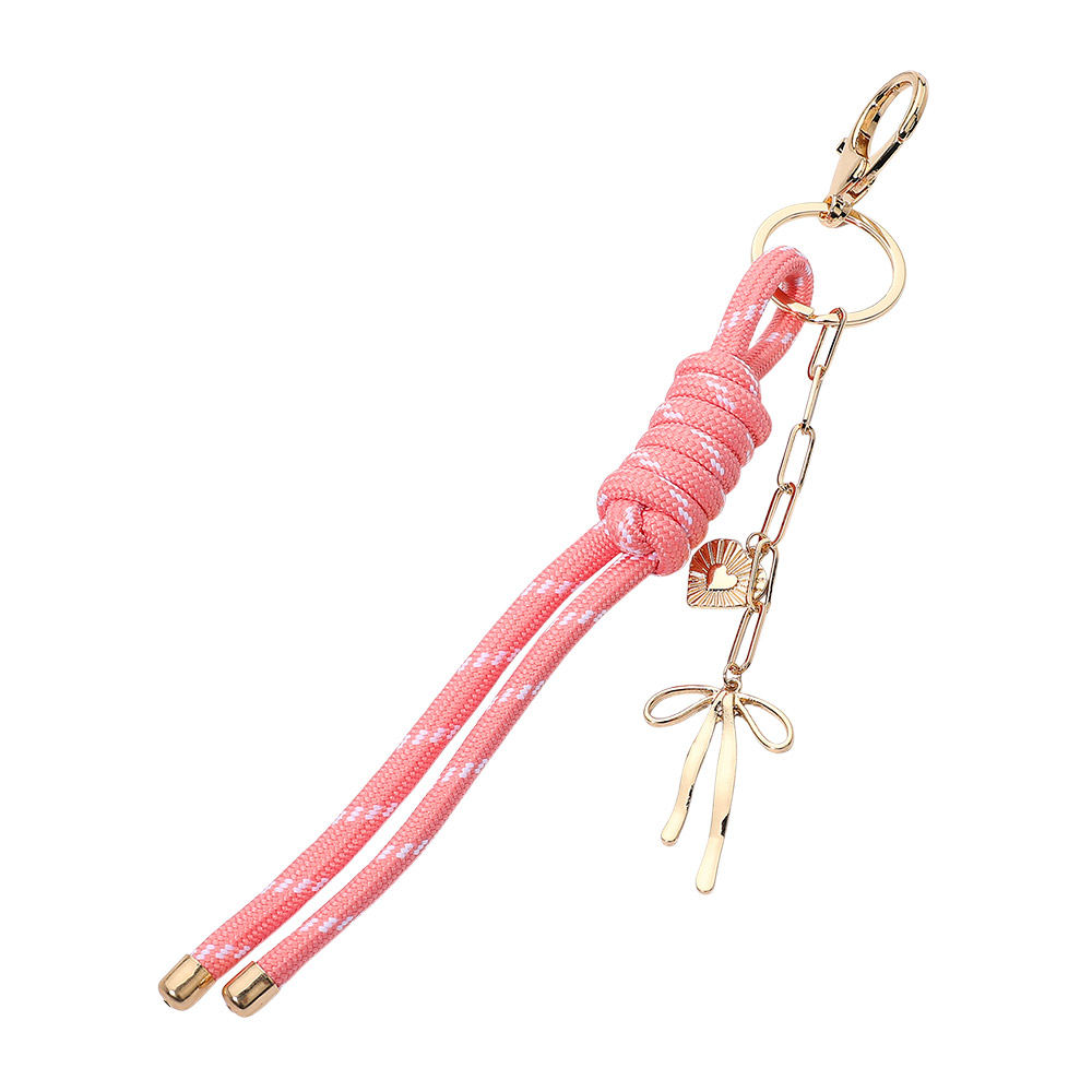 Details • Size : 9.5" L • Trendy rope keychain featuring a knotted cord design accented with dangling bow and heart charms, finished with a secure clip for easy attachment to keys or bags. Adds playful charm and stylish movement to everyday essentials while combining decorative flair with practical use. • Lead and Nickel Compliant