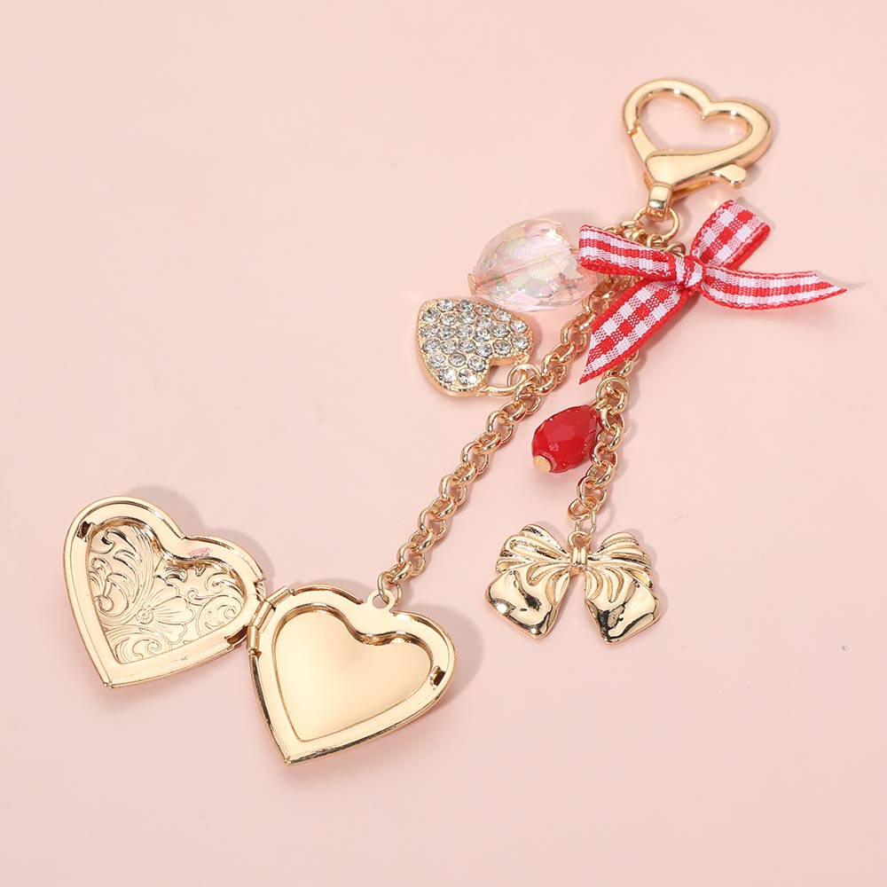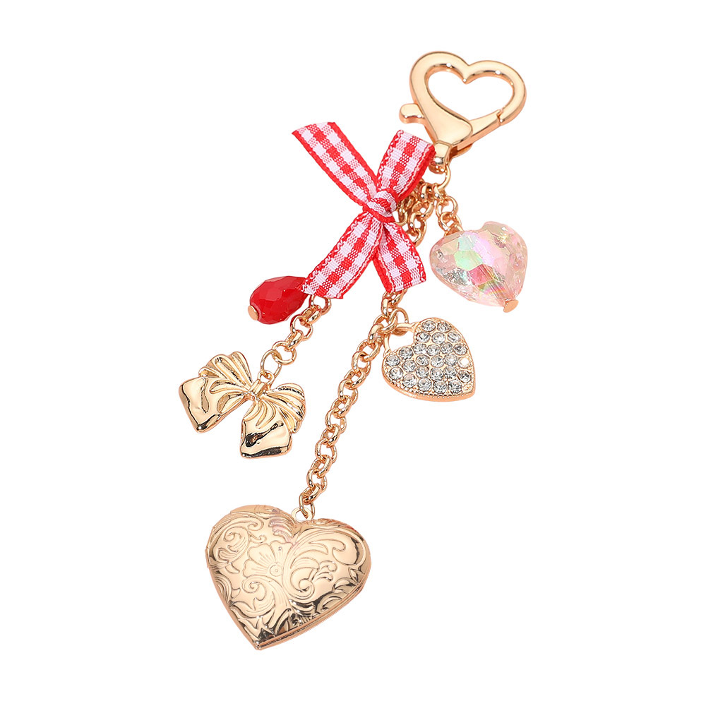 Details • Size : 1.5" X 5" • Charming heart locket keychain featuring engraved heart pendant, bow accent and multiple dangling charms for a cute and decorative touch. Perfect for bags, keys or gifting, this detailed accessory adds playful elegance and personalized style to everyday use. • Lead and Nickel Compliant