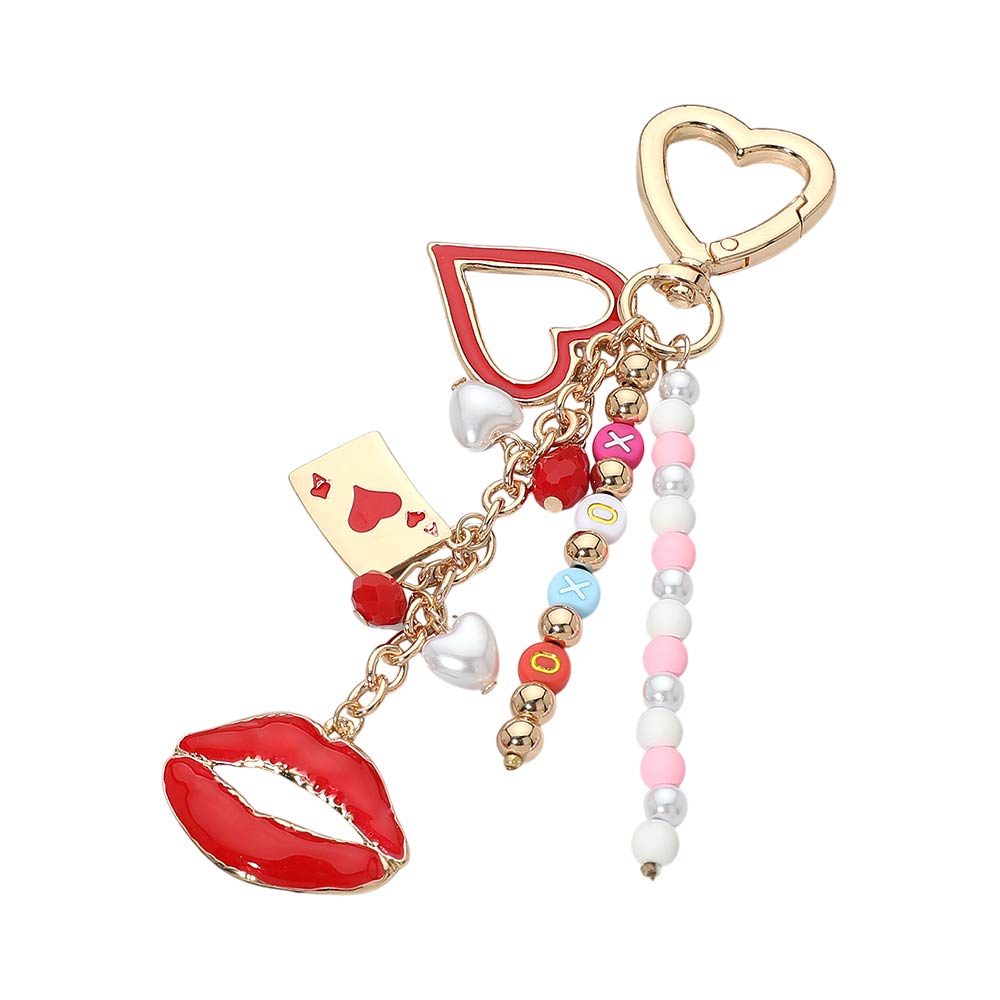 Details • Size : 5.6" L, 1.5" X 4" • Statement bag charm keychain designed with layered heart elements, playful icon charms, and beaded strand accents for eye-catching movement. A stylish accessory upgrade for handbags, backpacks, totes, or keys. Perfect for gifting, boutique collections, seasonal displays, and trendy accessory assortments that highlight personality-driven details and fun, expressive styling. • Lead and Nickel Compliant
