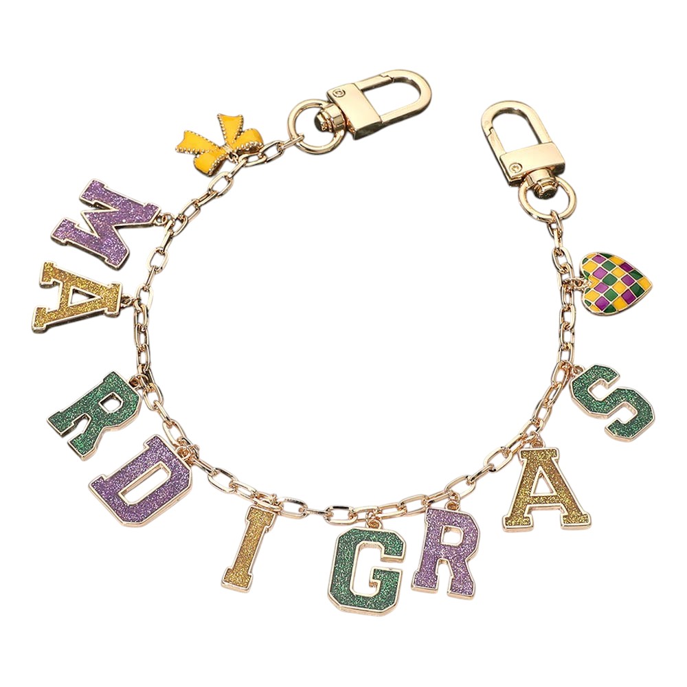 • Festive Mardi Gras–inspired letter charm chain featuring bold alphabet accents, playful icons, and dual clasp ends for easy attachment. Designed to clip onto handbags, totes, backpacks, or keyrings for a standout seasonal look. A fun statement accessory ideal for parade outfits, party styling, gift items, and eye-catching boutique displays.