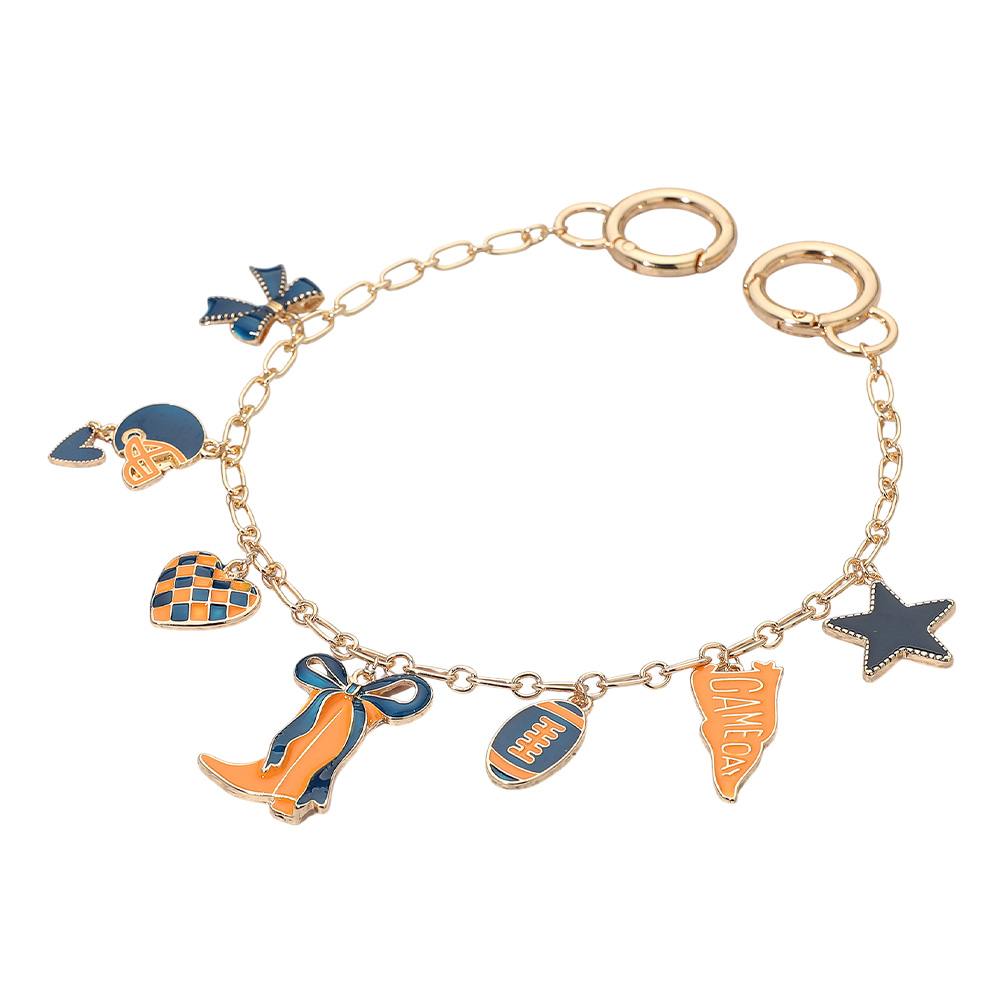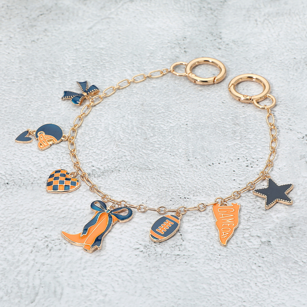 • Bag charm featuring playful gameday accents including football, helmet, boots, stars, hearts, and cheer icons. A fun accessory to show team spirit, personalize bags, and add a sporty touch to gameday outfits.